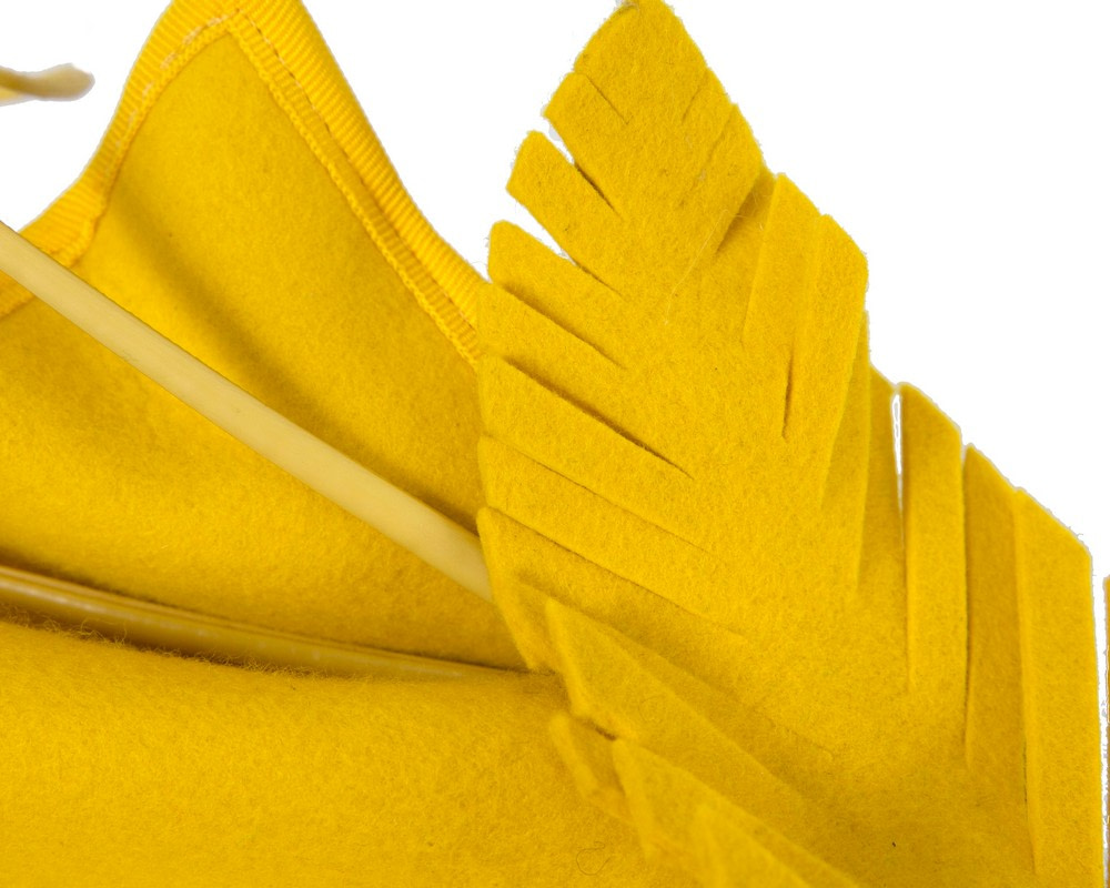 Exclusive yellow winter racing fascinator created in Melbourne by our experienced milliners. Pure wool felt base decorated with felt leaf and curly feathers. Perfect choice for your next autumn or winter racing meting.