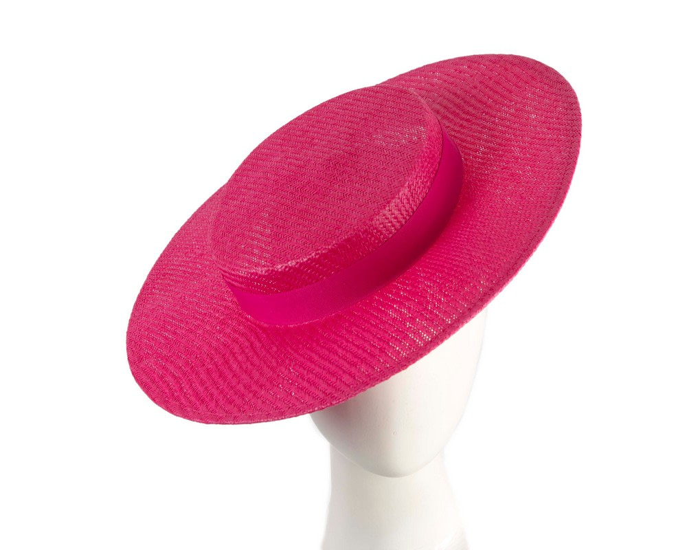 Wide brim fuchsia boater hat placed on the headband for extra comfort. Great choice for your next spring racing outfit.
