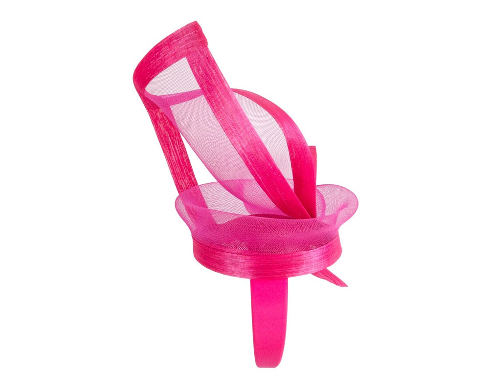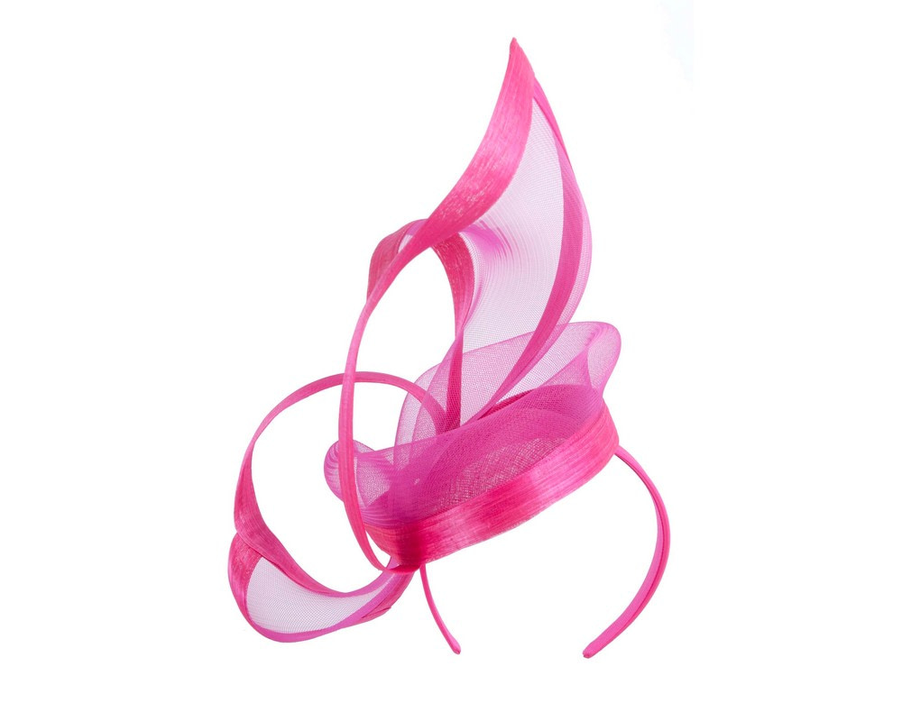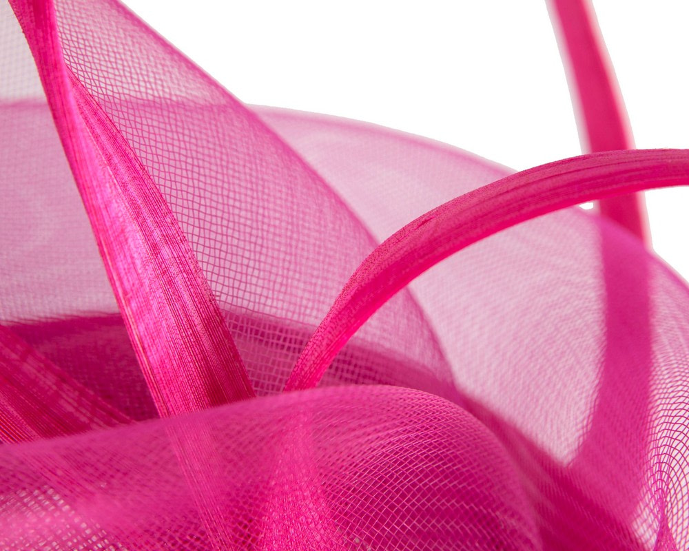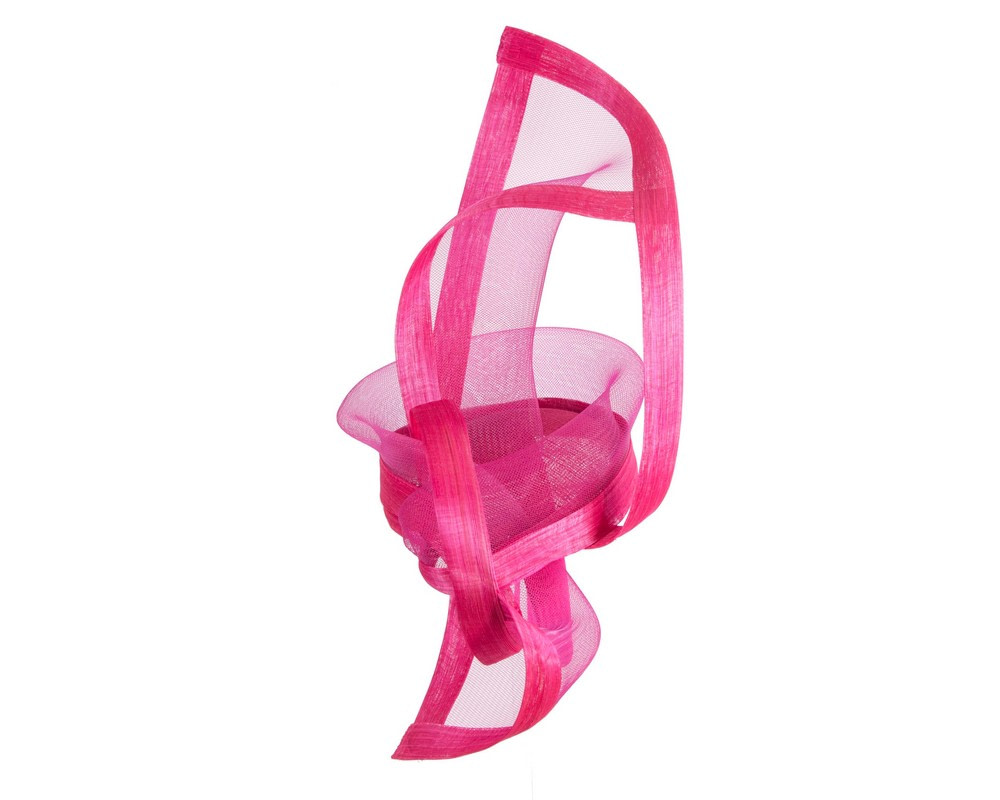 This gorgeous large twisted fuchsia fascinator is an ideal complement for any outfit. Wear it at Melbourne Cup, Ascot, Kentucky Derby or any other special occasion and it is guaranteed to turn heads! Hand made in Melbourne from luxurious french cloth fabric and crinoline, this hat has a band firmly hold it in place.