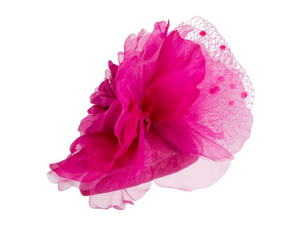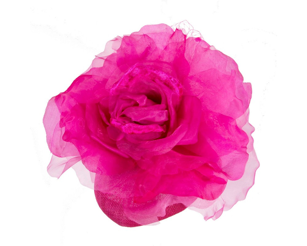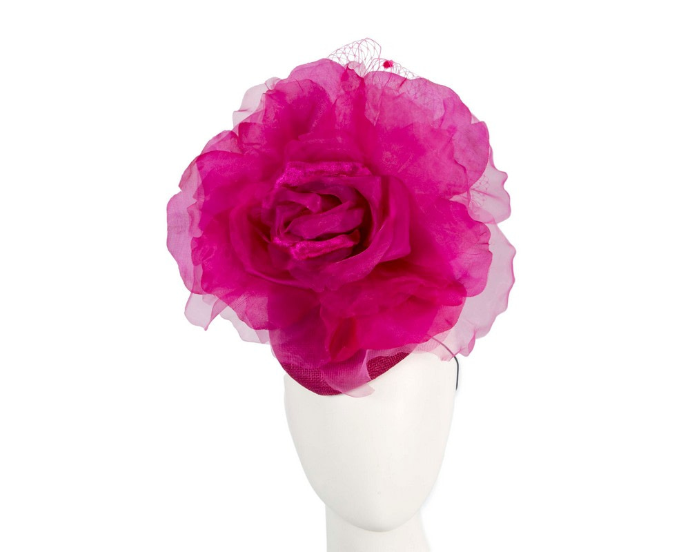 Exclusive creation by Fillies Collection milliners. Fuchsia pillbox base embellished with large silk flowers. Wear it any way you like with supplied elastic or take an advantage of optional headband.