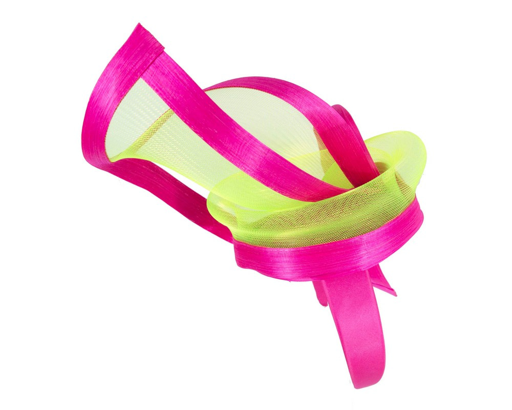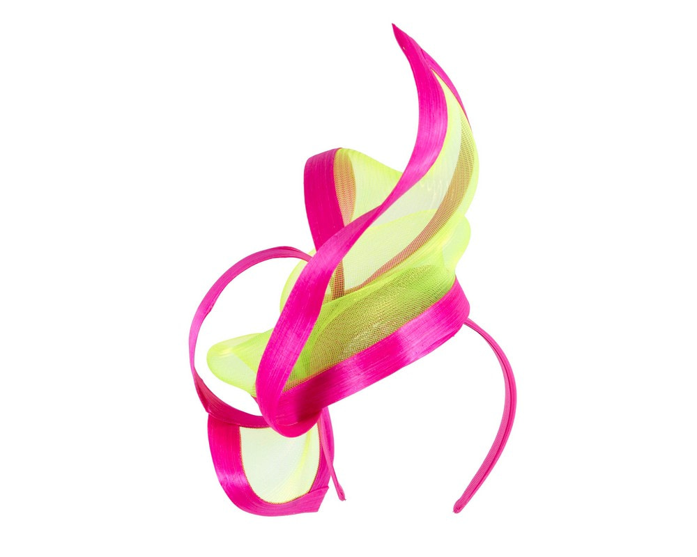 This gorgeous large twisted lime and fuchsia fascinator is an ideal complement for any outfit. Wear it at Melbourne Cup, Ascot, Kentucky Derby or any other special occasion and it is guaranteed to turn heads! Hand made in Melbourne from luxurious french cloth fabric and crinoline, this hat has a band firmly hold it in place.