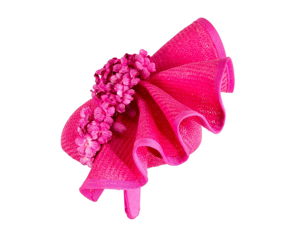 Classic fuchsia pillbox base with stylish decoration and forget-me-not flower arrangement. This fascinator will be a jewel of your next spring racing outfit.