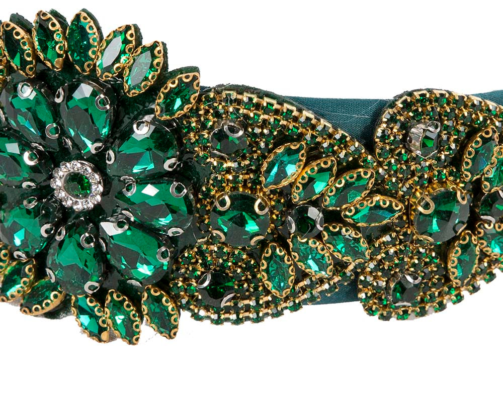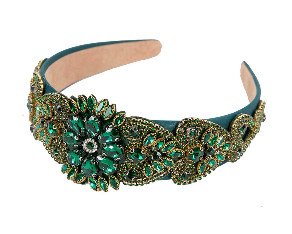 Green jewellery fascinator headband by Cupids Millinery. Wide headband covered with crystal flowers.