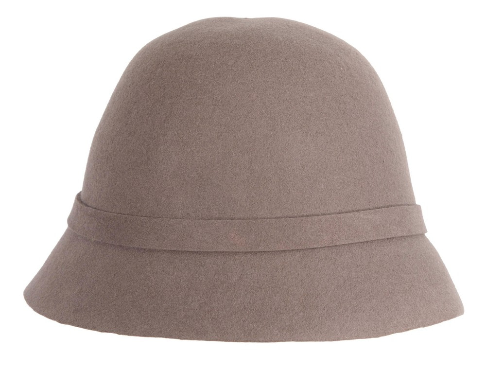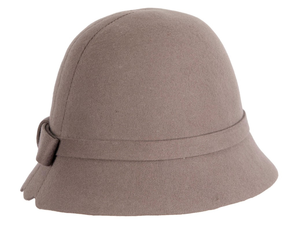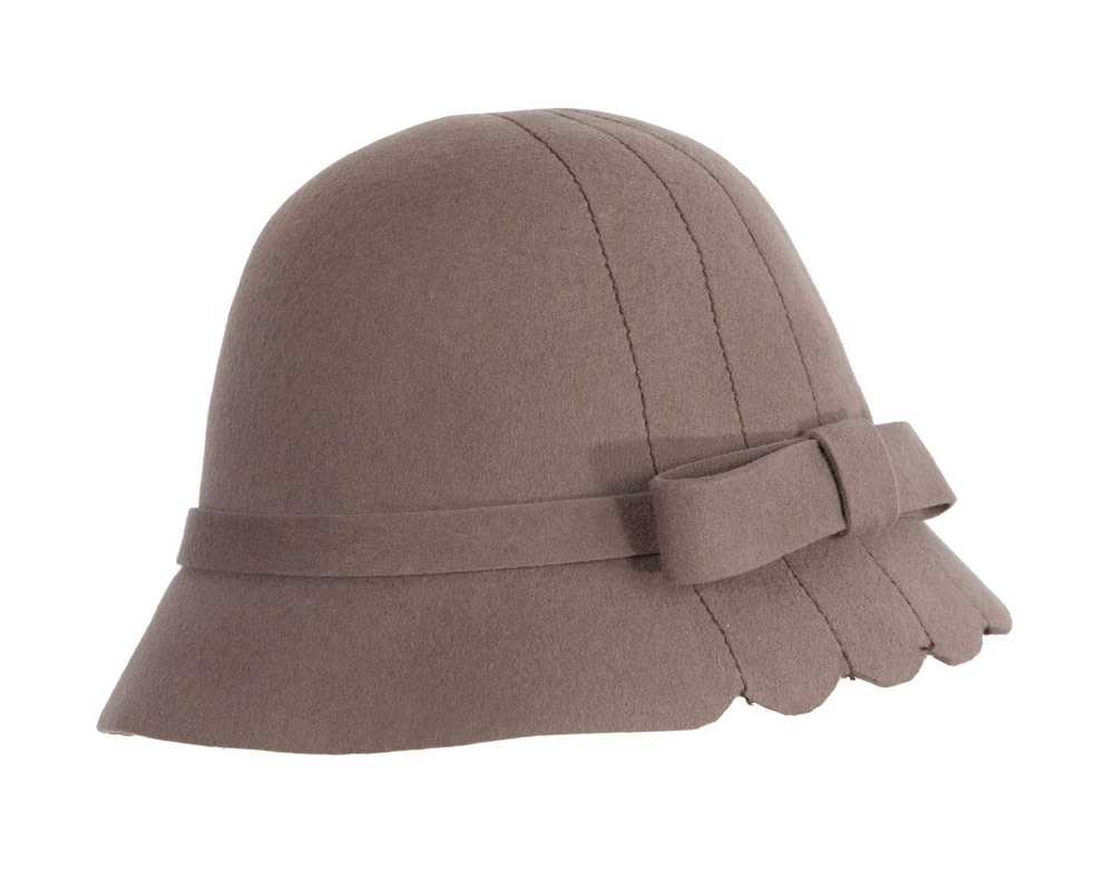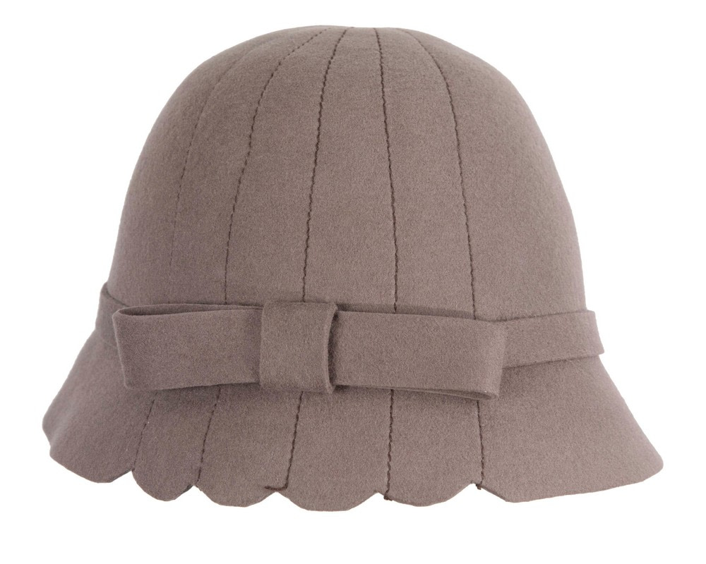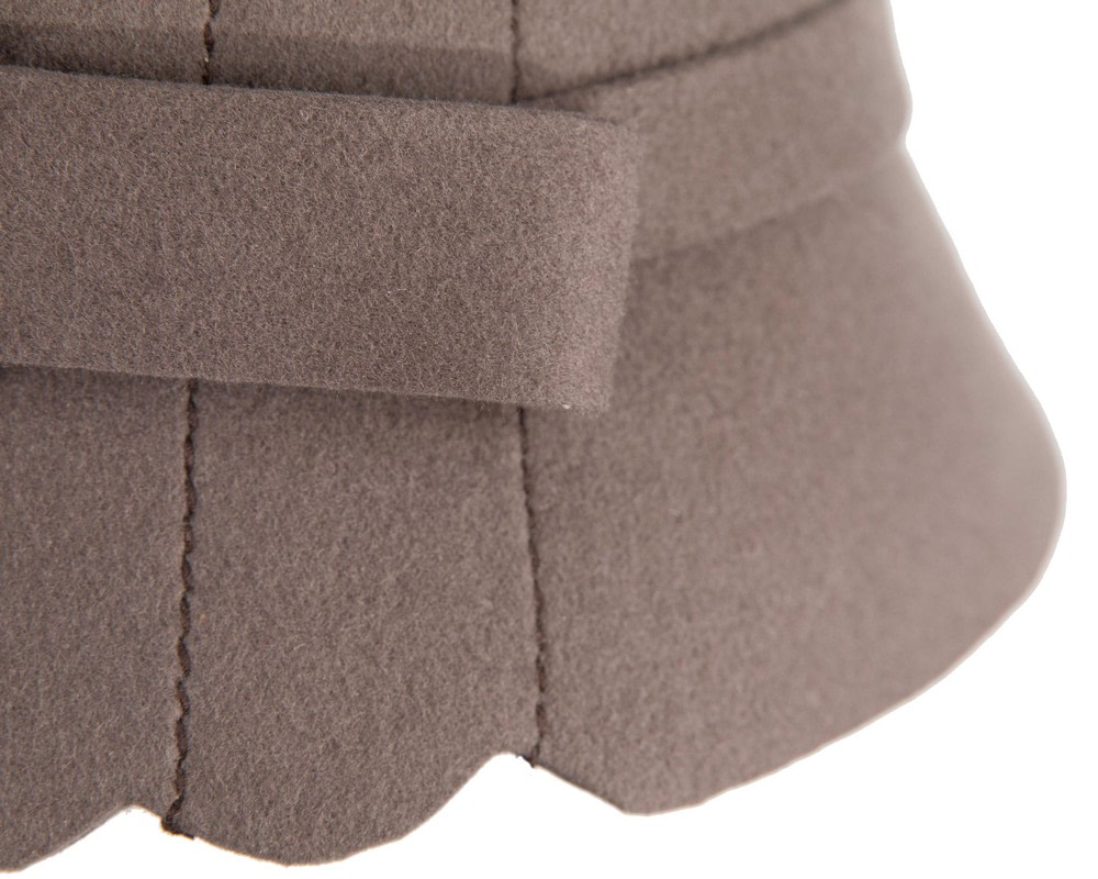 Stylish design grey felt ladies cloche hat with raw edge, bow and stitching pattern. Great choice for your winter outfit