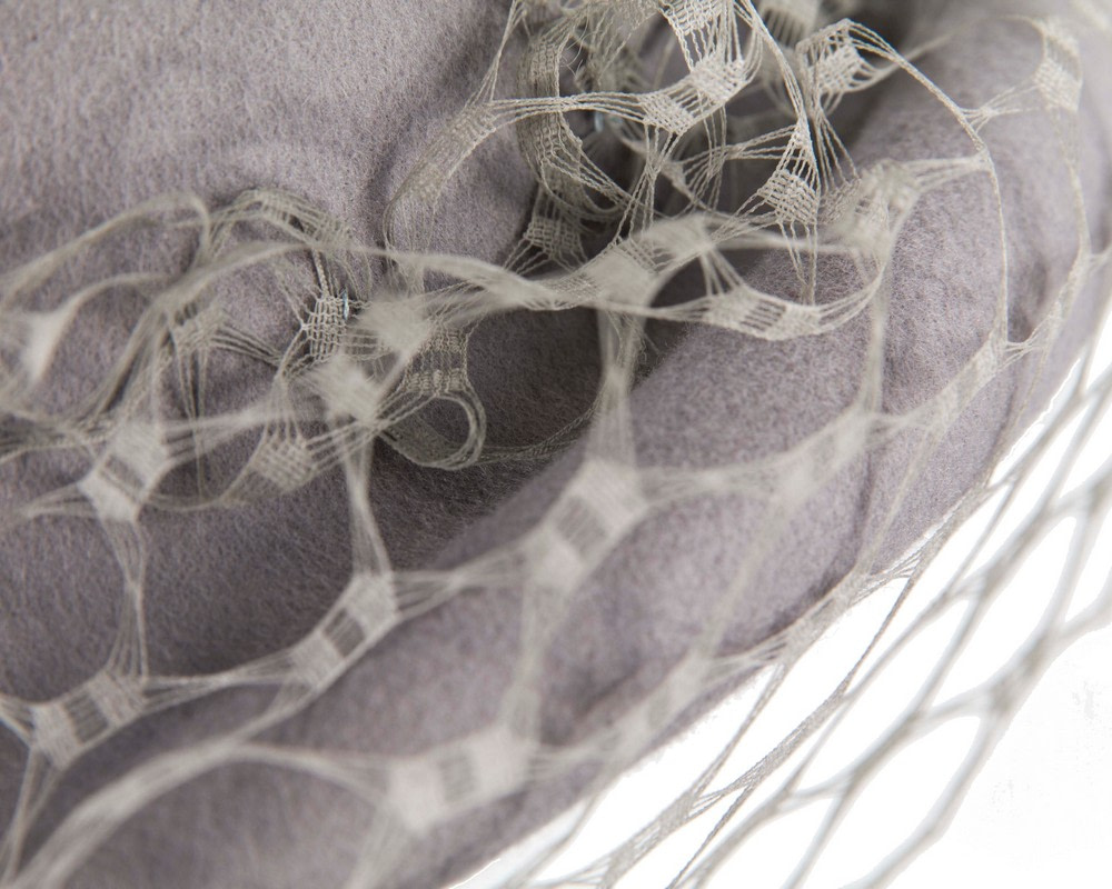 Grey fashion hat featuring classic cloche design with rolled double brim and face veil. Great choice for everyday smart wear or special occasion.