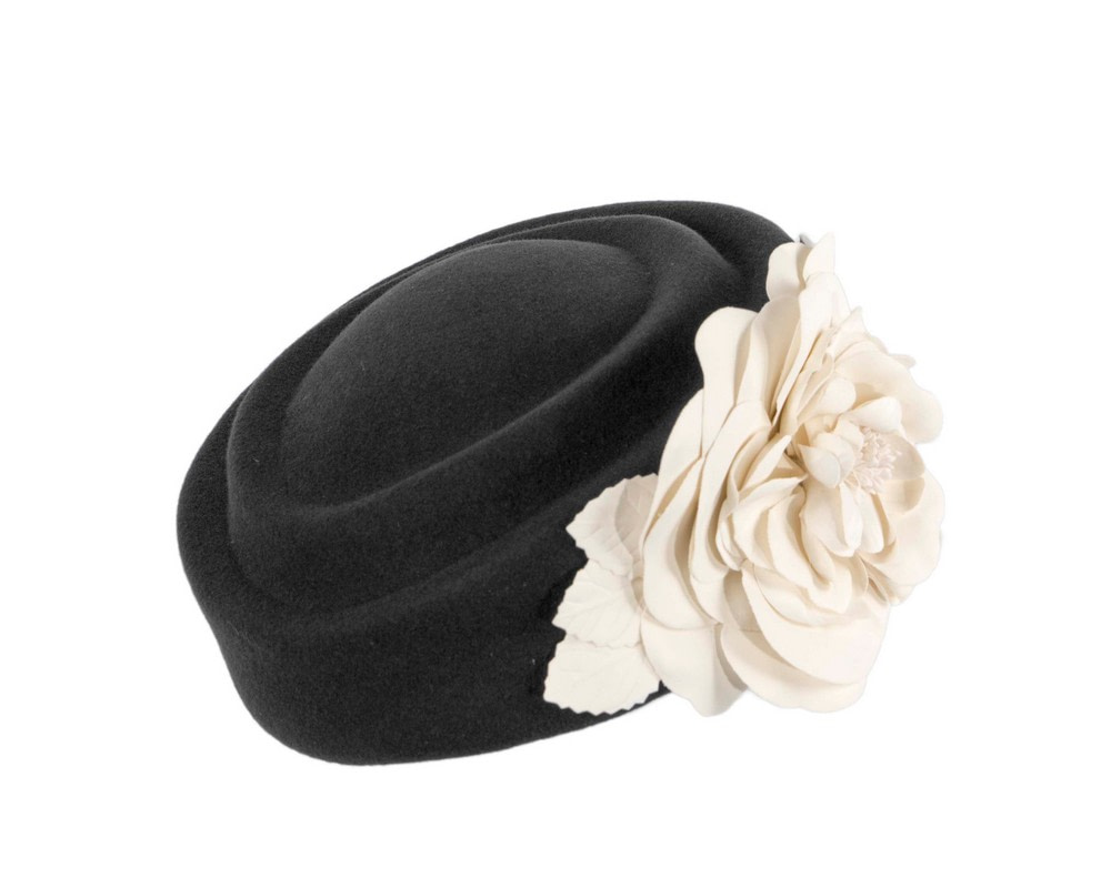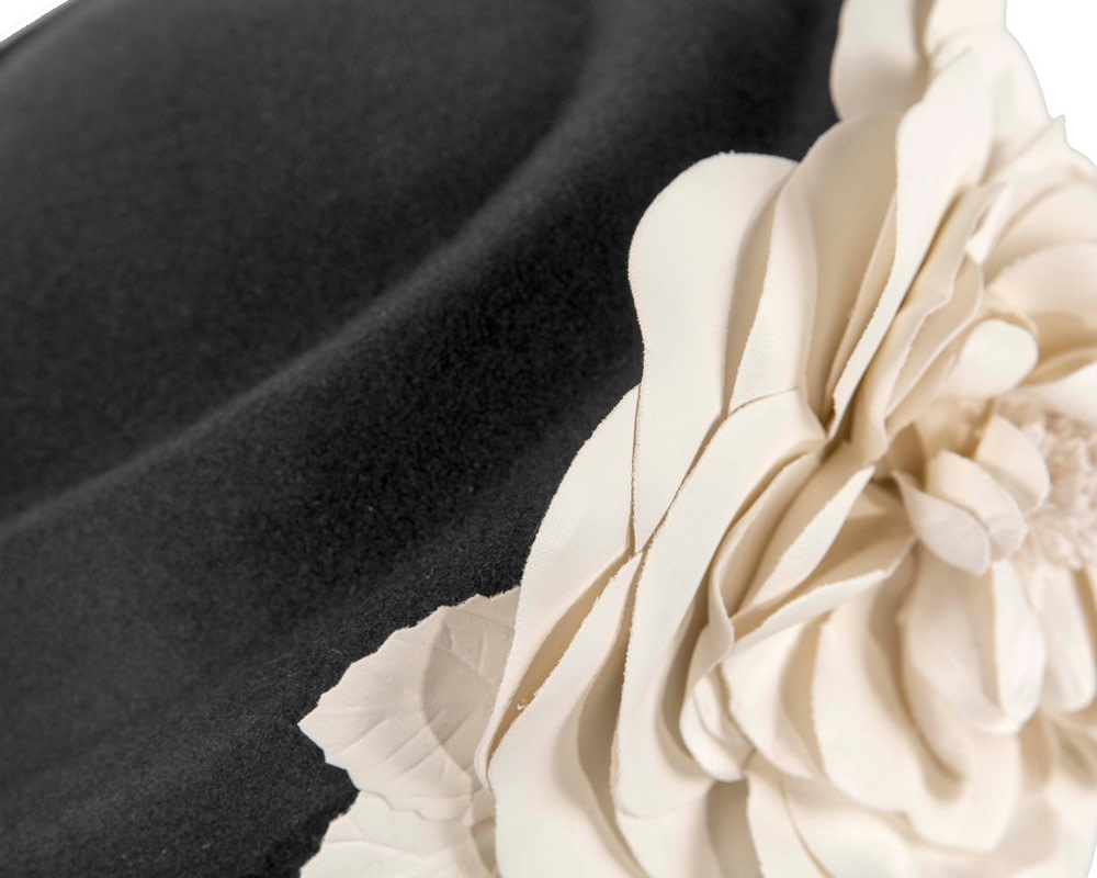 Elegant large black fashion beret hat, made from pure wool felt and decorated with large cream faux leather flower. Great choice for racing events or special occasions.