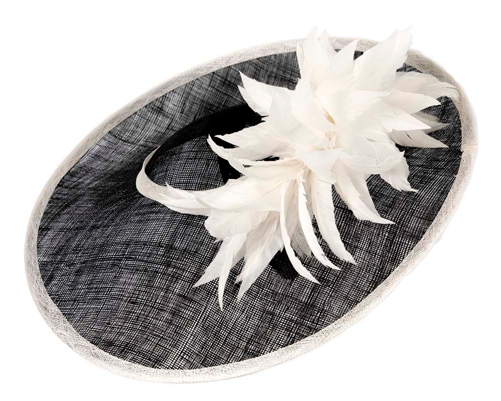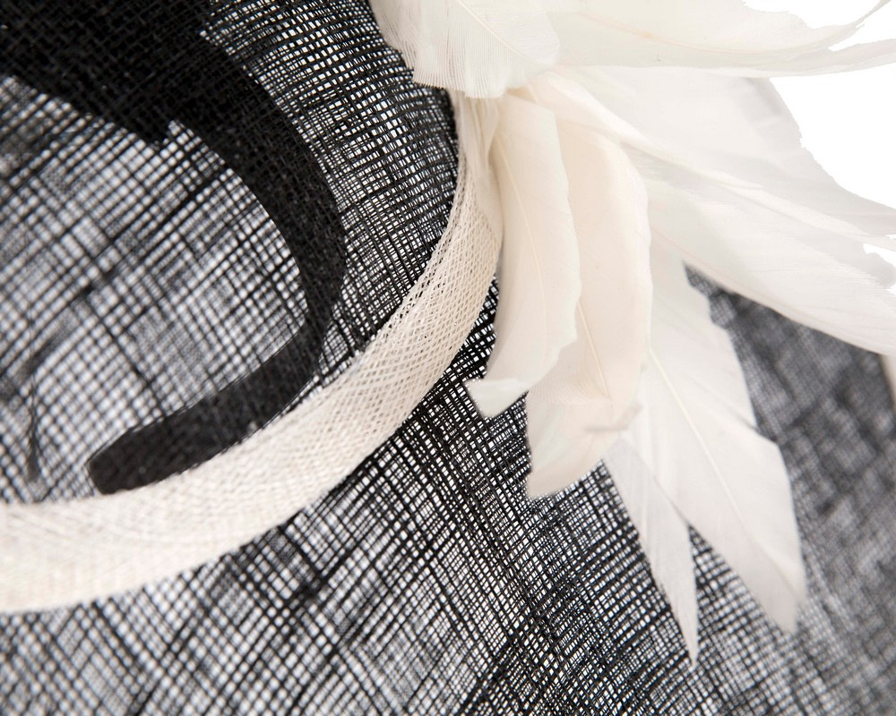 Large black hatinator decorated with generous contrast cream feather cocktail. Great choice for spring racing carnivals.