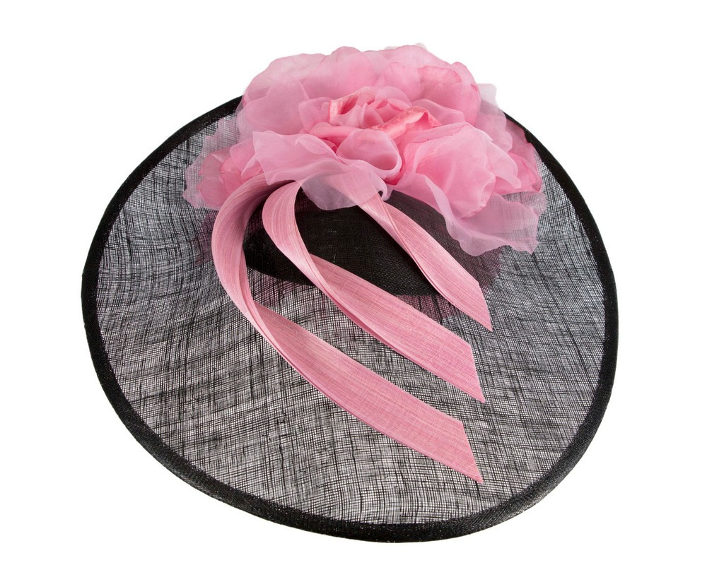Latest Fillies Collection racing fascinator. Large black sinamay plate, topped with hand-made pink silk flowers, this fascinator will turn heads when you wear it at Melbourne Cup, Ascot or your local racing event.