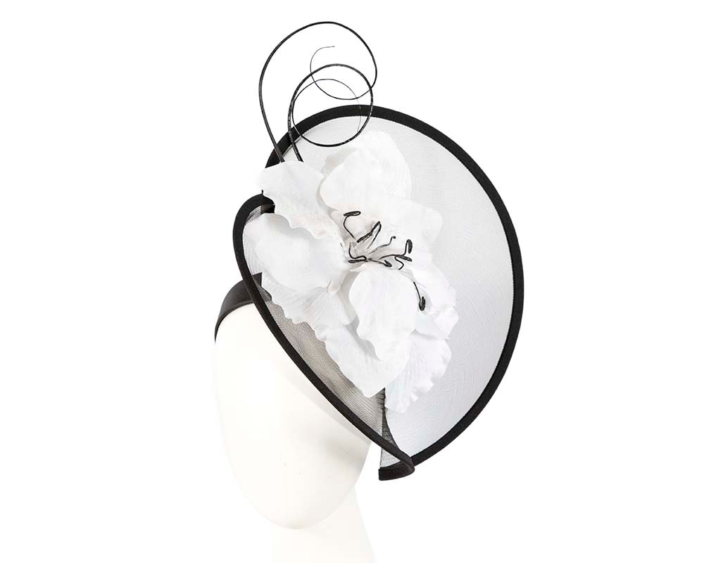 Hand made in Melbourne, this large black fascinator features elegant heart shape with large white flower. We can make this style in many colors on request — please enquire.