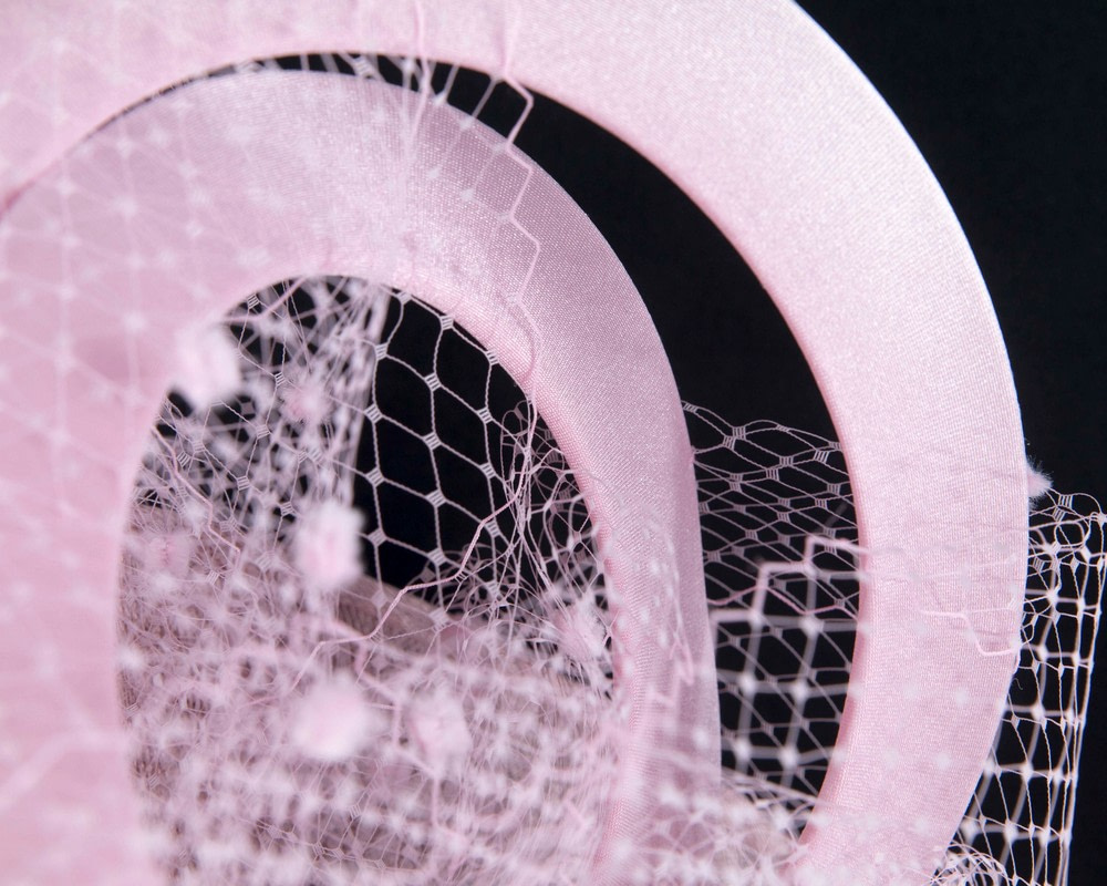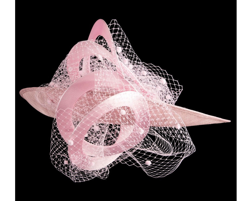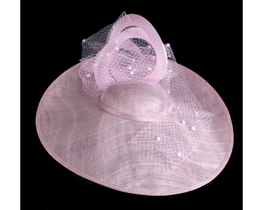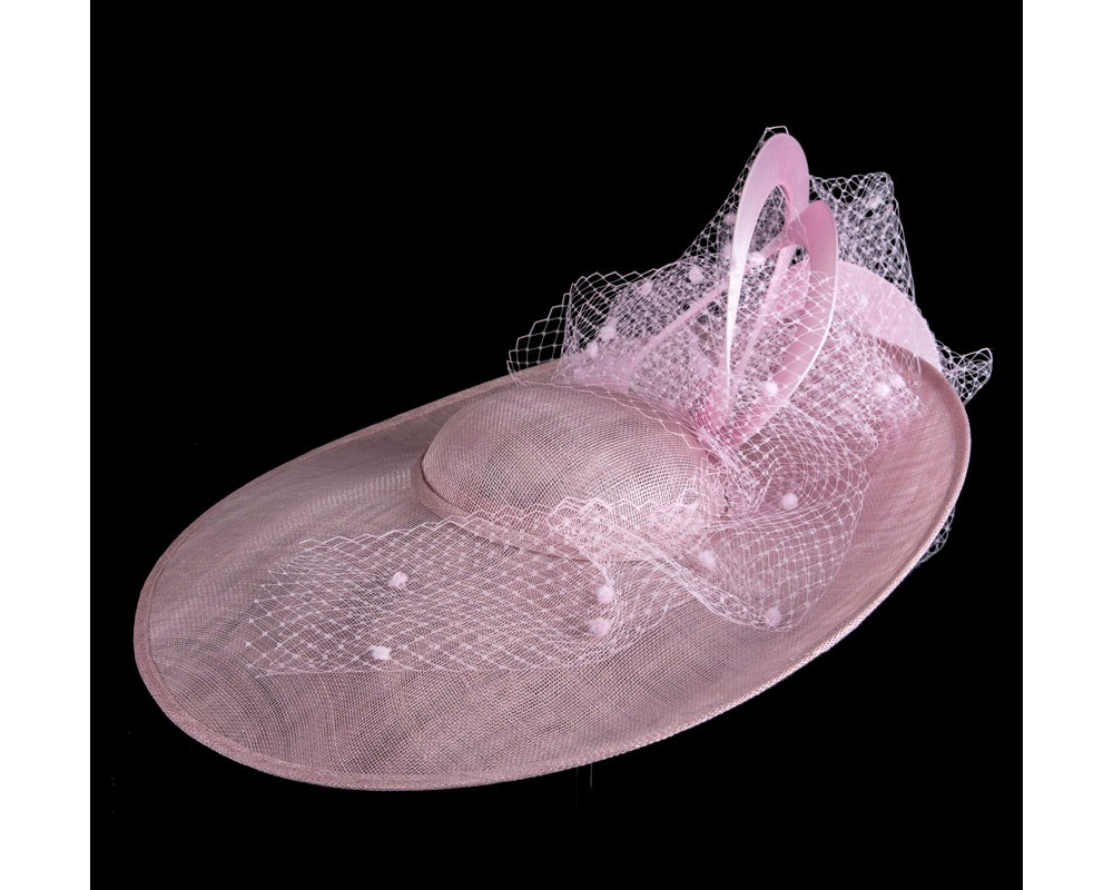 Latest Fillies Collection racing fascinator. Wide brim dusty pink hat base, topped with large hand-made loops and veiling arrangement, this fascinator will turn heads when you wear it at Melbourne Cup, Ascot or your local racing event.