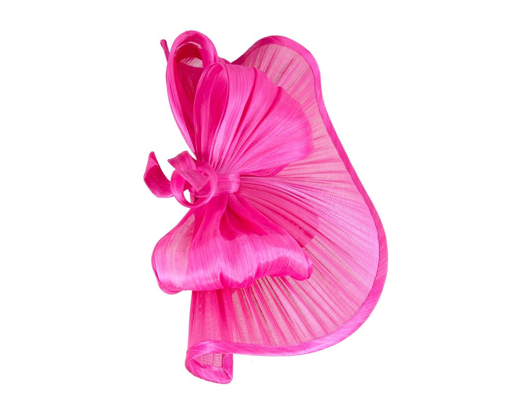 Large tall fuchsia fascinator made from real jinsin fabric and dressed with silk abaca bow. Hand created by our experienced milliners in the hearts of Melbourne to make you look your best ate next racing event.