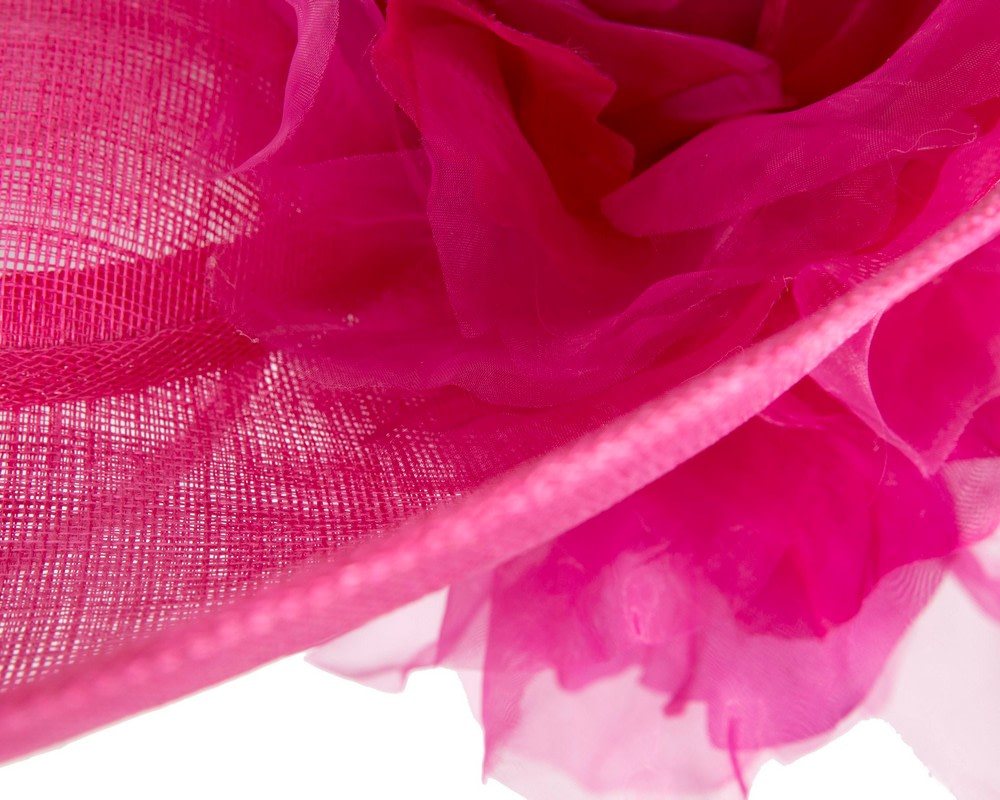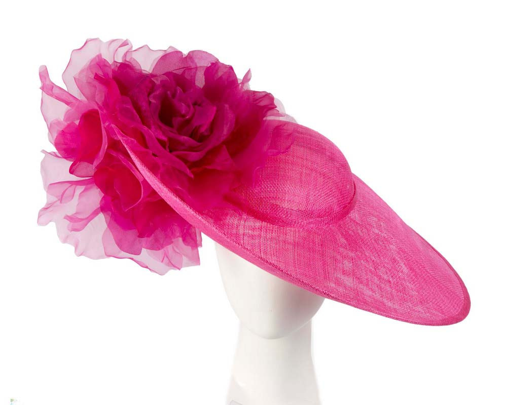 Latest Fillies Collection racing fascinator. Large fuchsia hat base, topped with hand-made silk flowers, this fascinator will turn heads when you wear it at Melbourne Cup, Ascot or your local racing event.