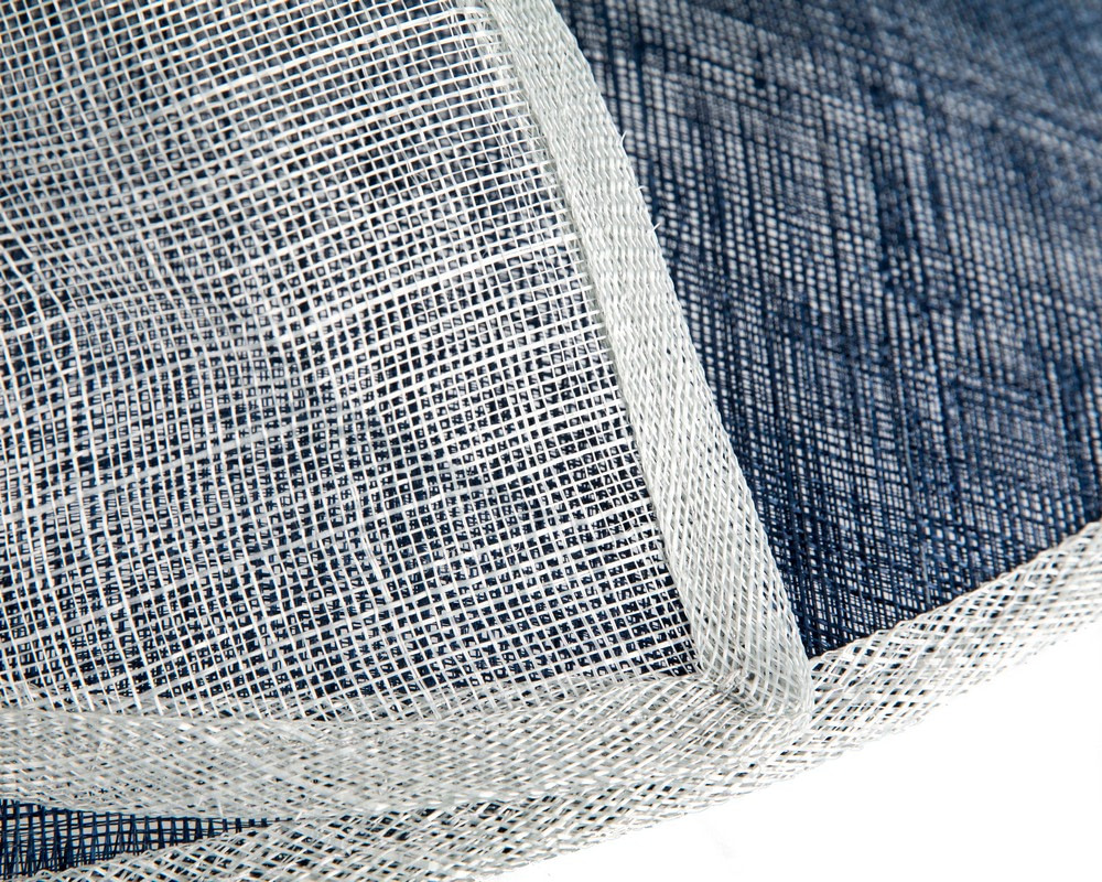 This large navy sinamay hat by Max Alexander features wide, down-turned brim decorated with large contrast light blue bow