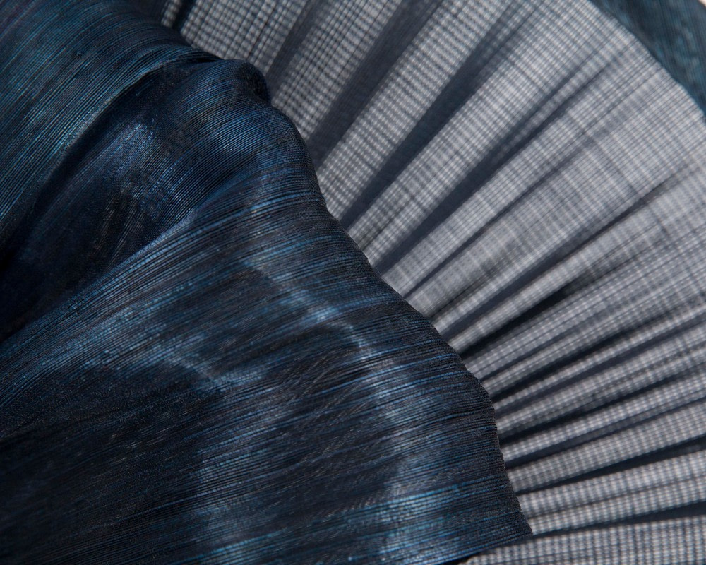 Large tall navy fascinator made from real jinsin fabric and dressed with silk abaca bow. Hand created by our experienced milliners in the hearts of Melbourne to make you look your best ate next racing event.