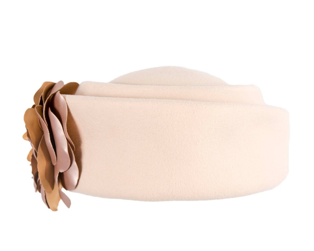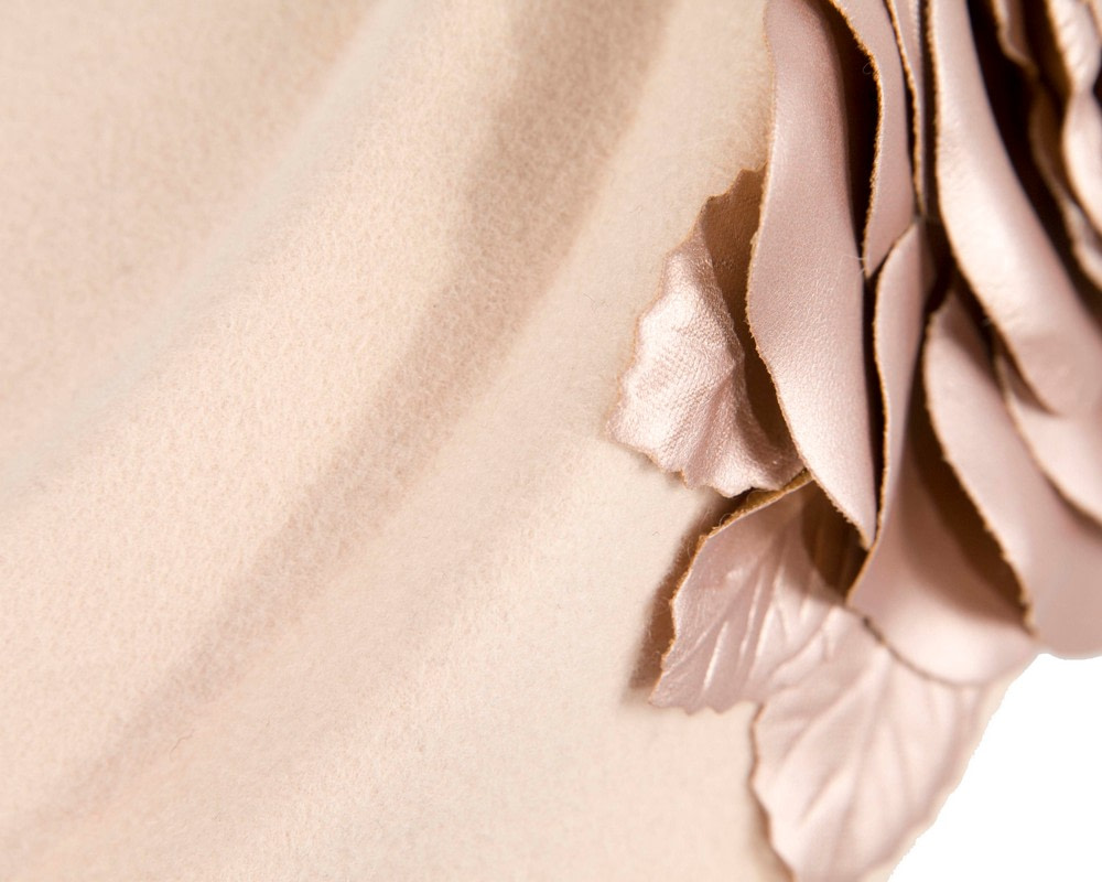 Elegant large nude fashion beret hat, made from pure wool felt and decorated with large rose gold faux leather flower. Great choice for racing events or special occasions.