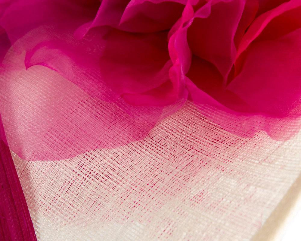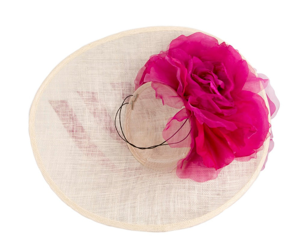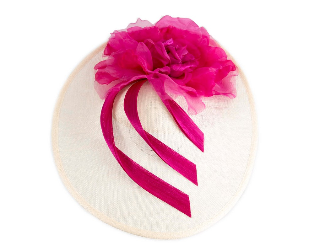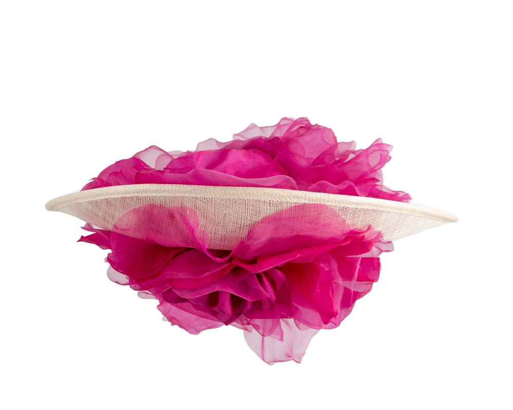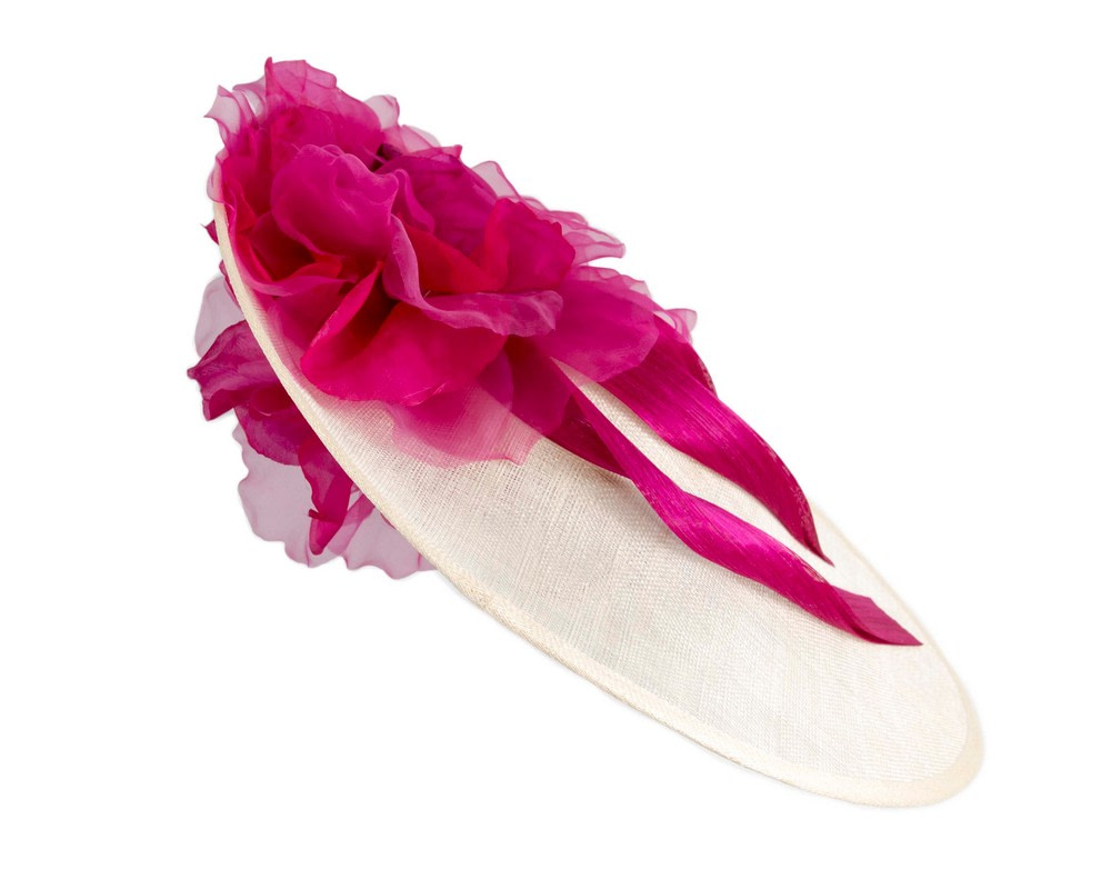 Latest Fillies Collection racing fascinator. Large cream sinamay plate, topped with hand-made fuchsia silk flowers, this fascinator will turn heads when you wear it at Melbourne Cup, Ascot or your local racing event.