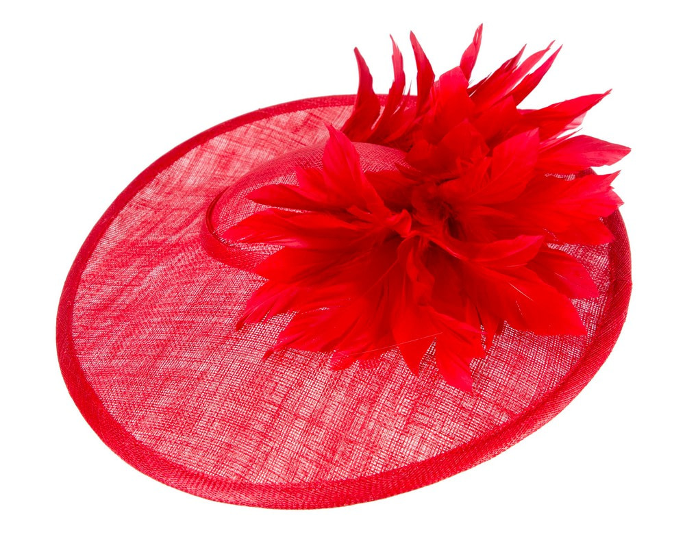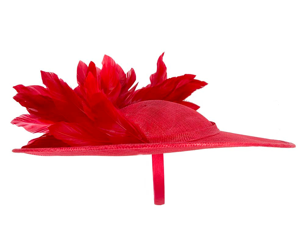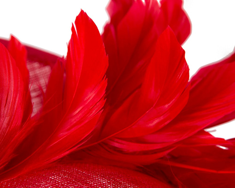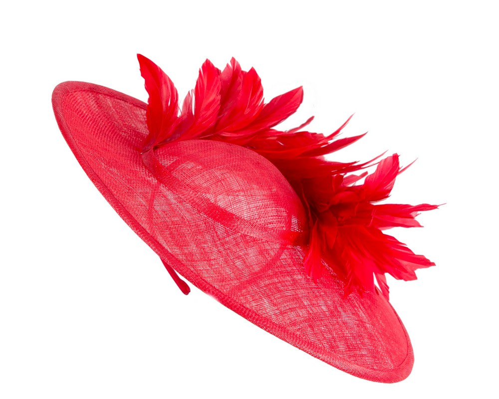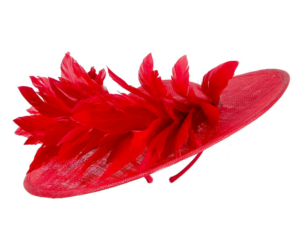 Large red hatinator decorated with generous feather cocktail. Great choice for spring racing carnivals.