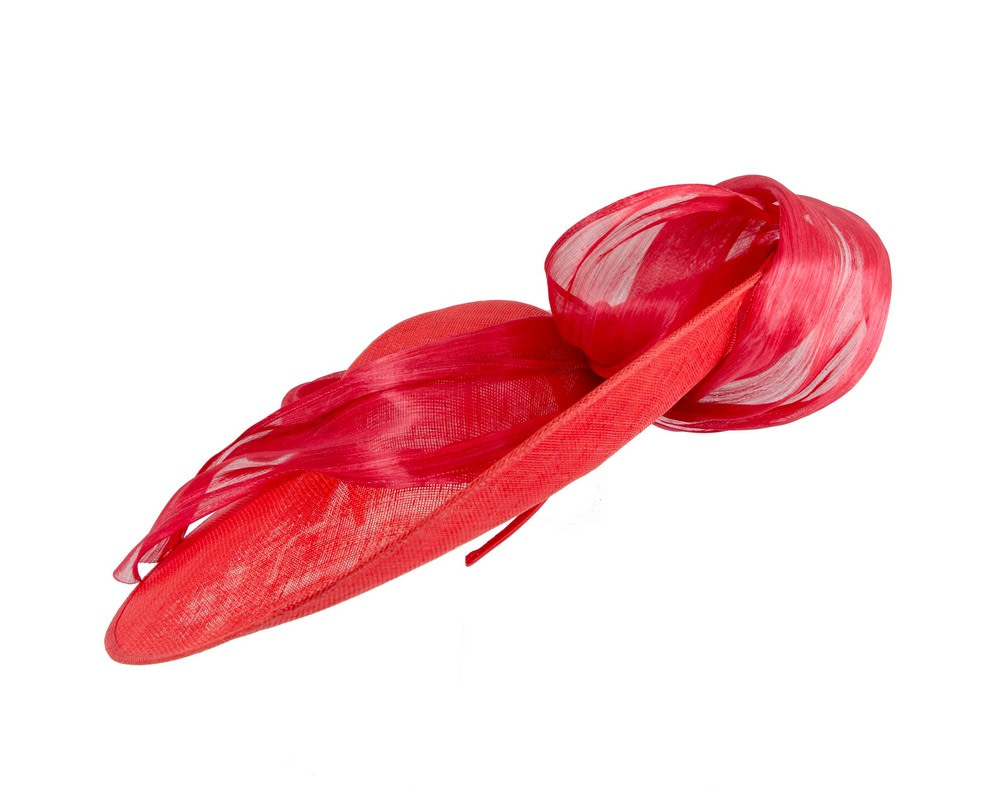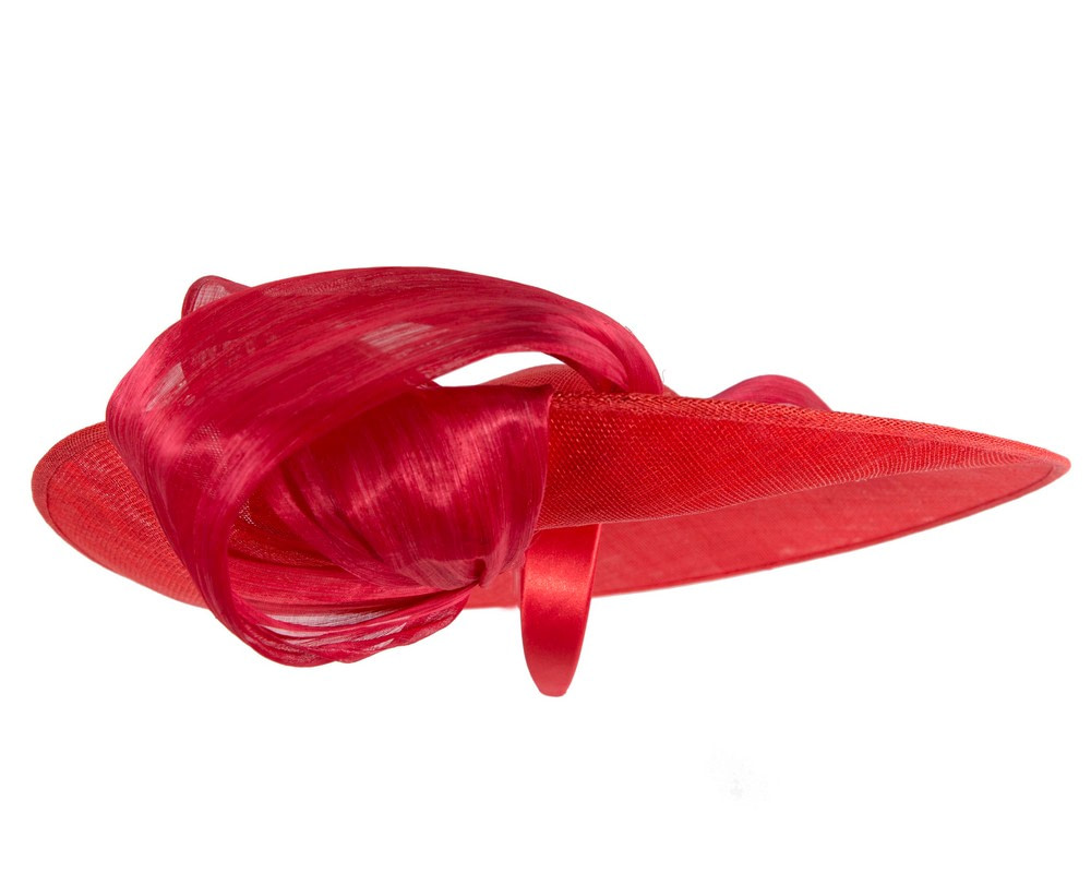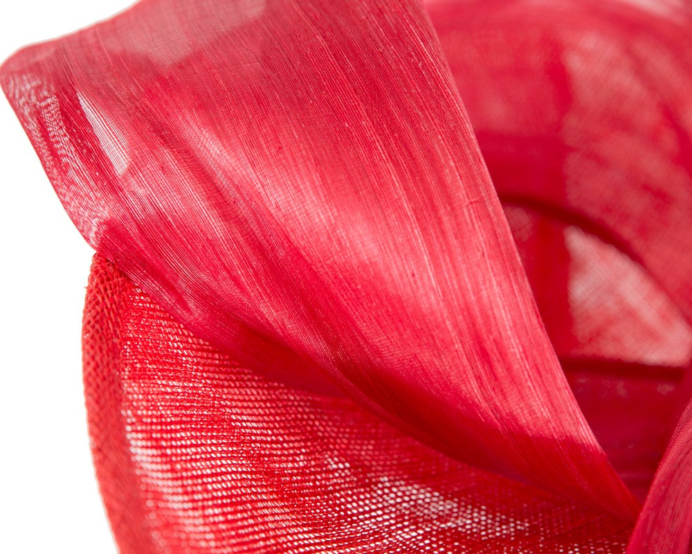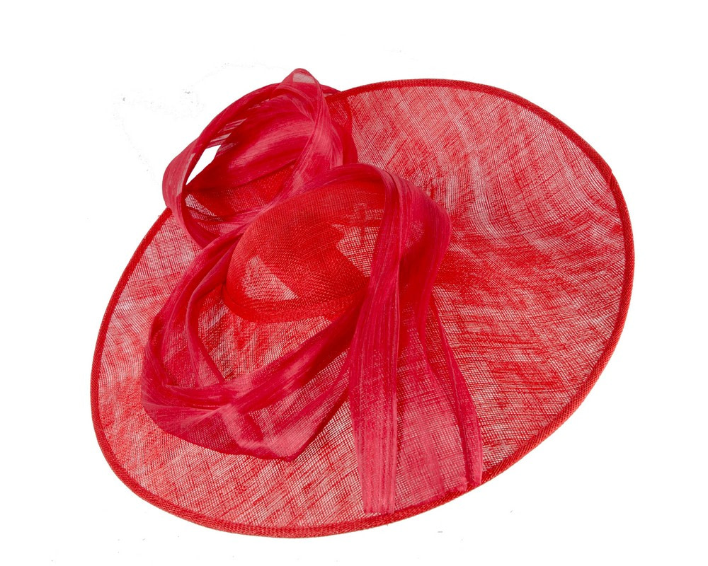 Large, wide brim red sinamay hatinator decorated with soft waves of real silk abaca and mounted on the headband. Great addition to your next spring racing outfit.
