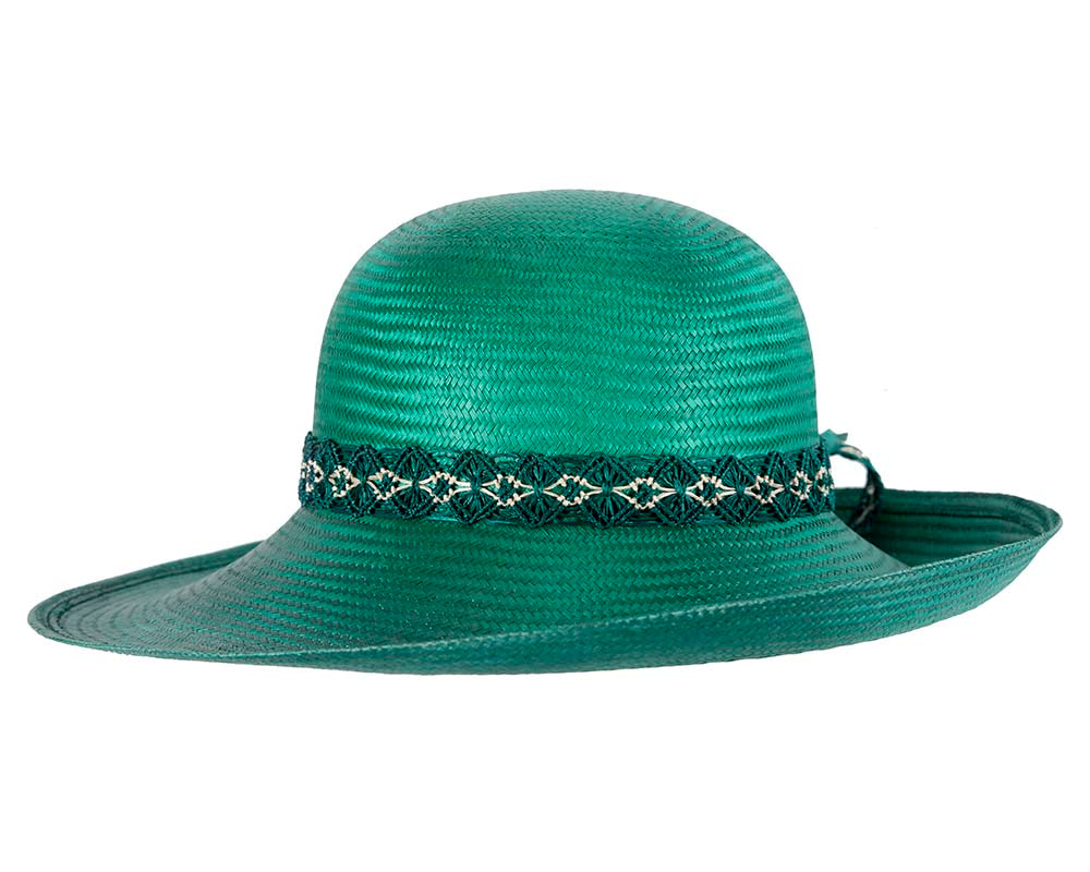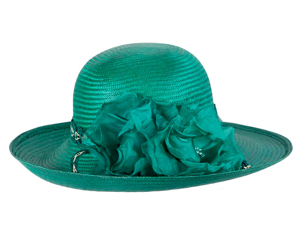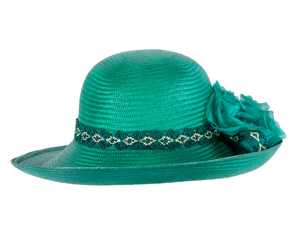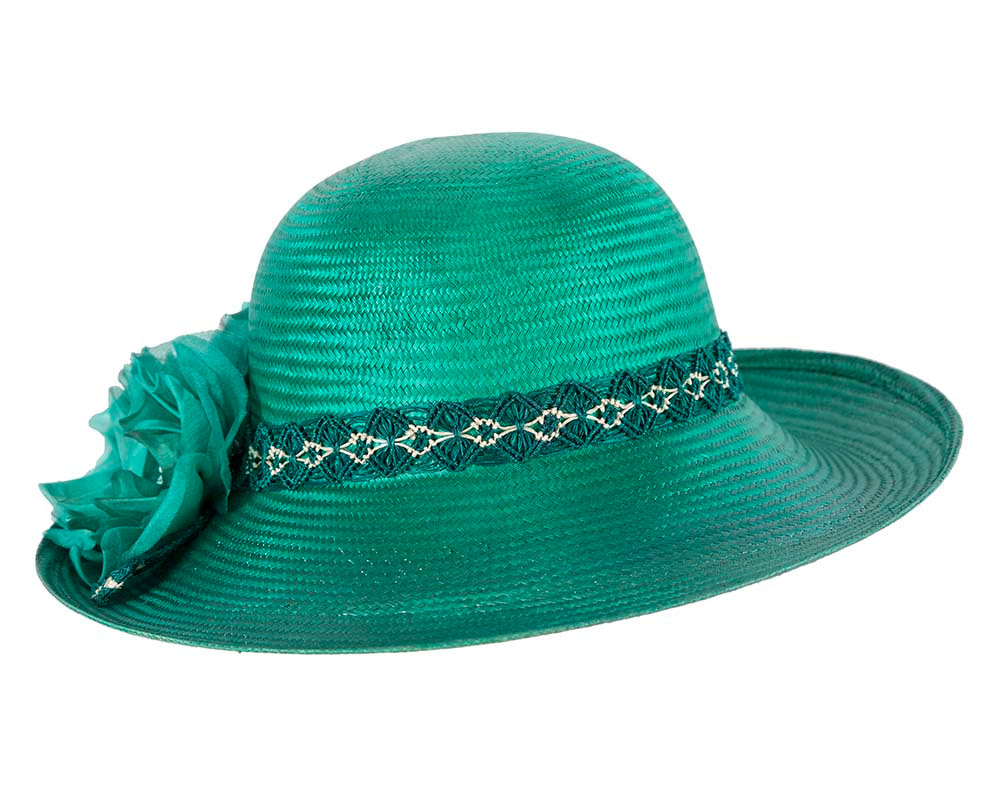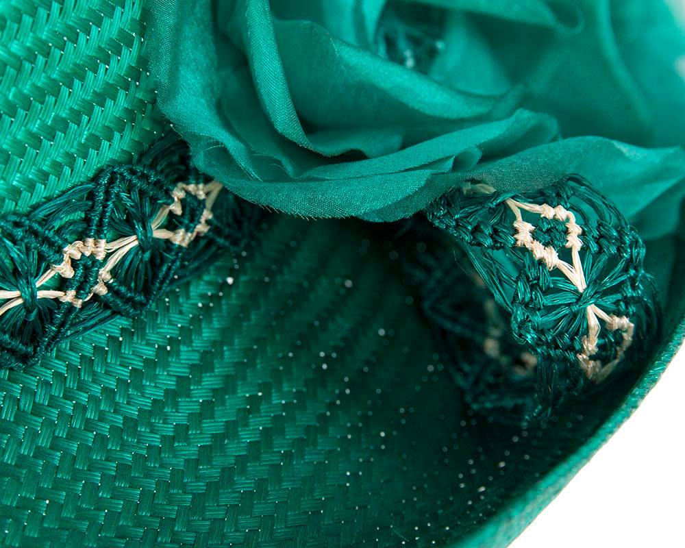 Made from fine sisal straw, this teal green green fashion hat features wide brim, classic, elegant shape, stylish headband and large flower. A perfect racing accessory for Melbourne Cup, Ascot or any special event.