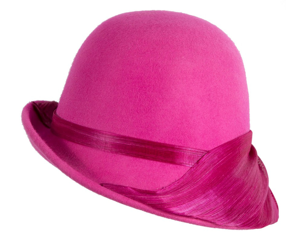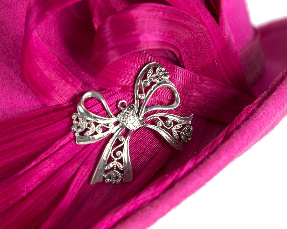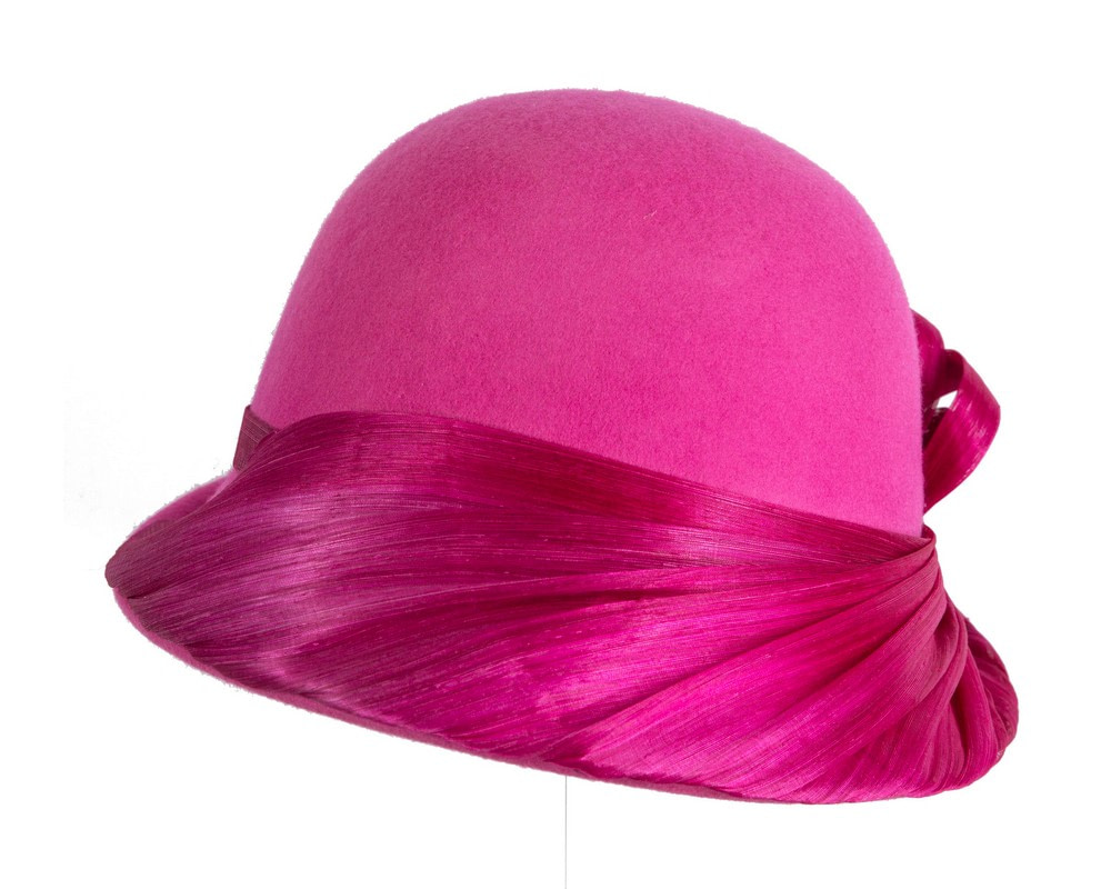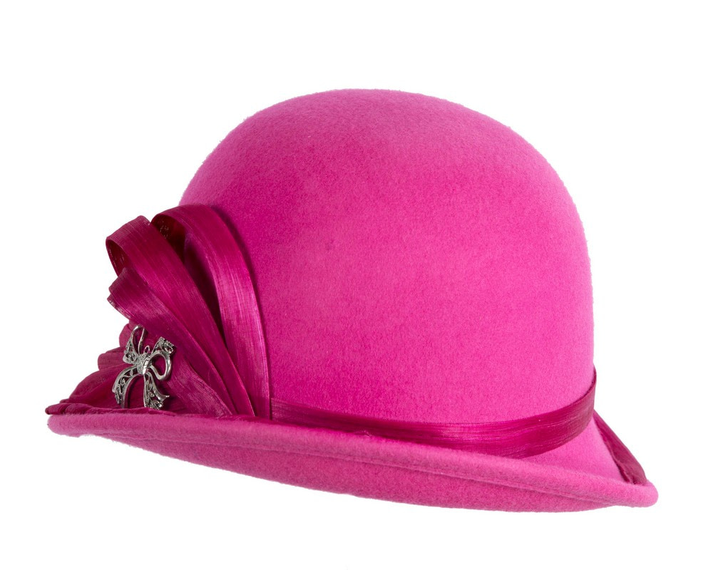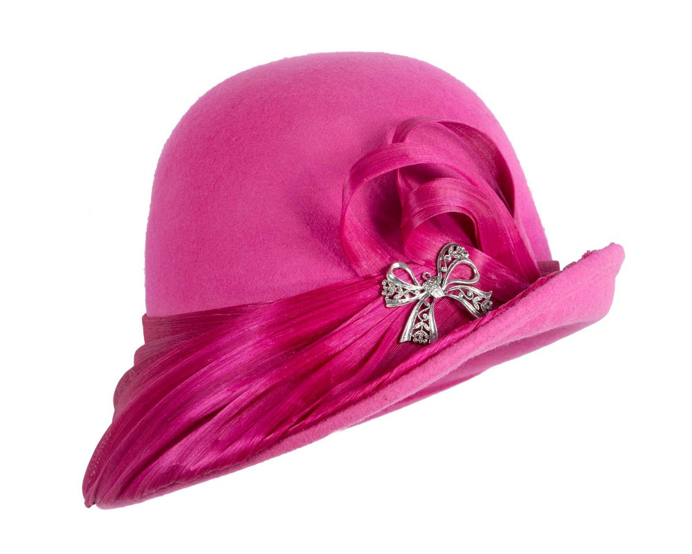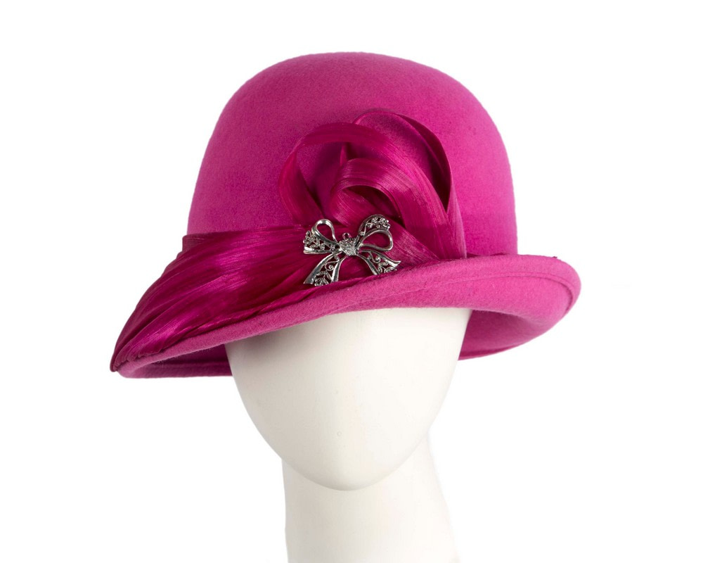 Fuchsia fashion winter felt hat by Cupids Millinery Melbourne. Classic cloche with upturned brim, draped in real silk abaca with addition of stylish bow buckle.