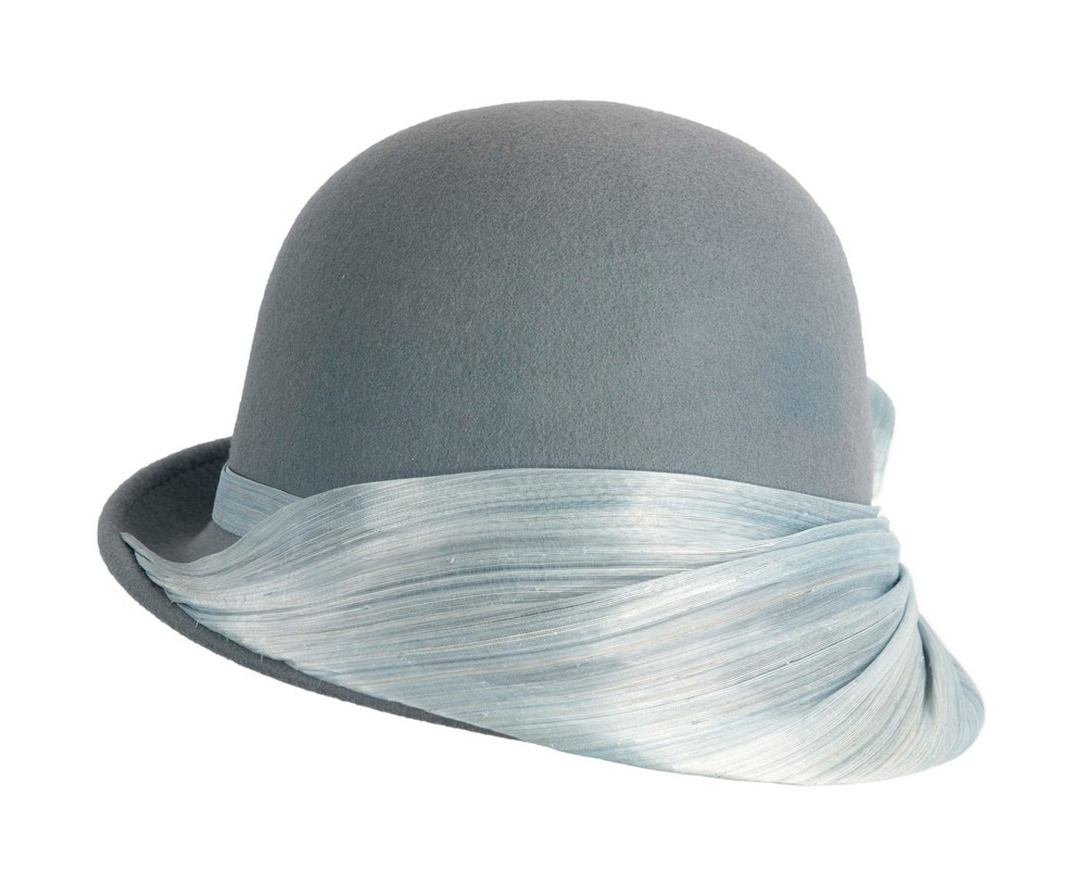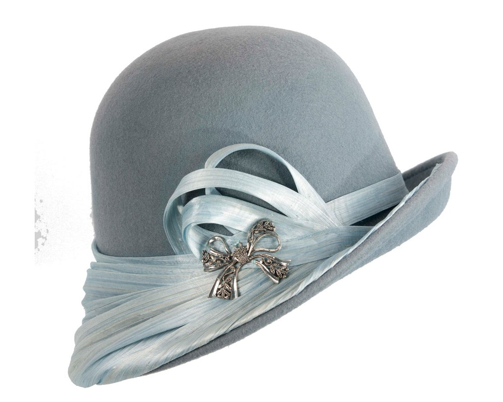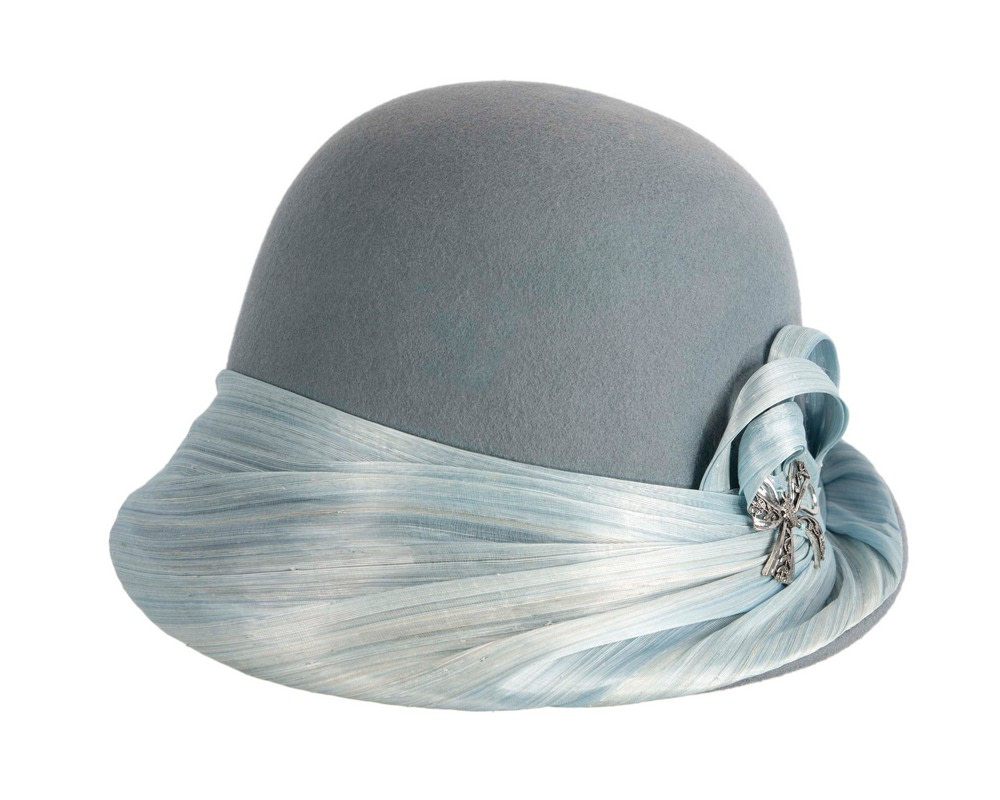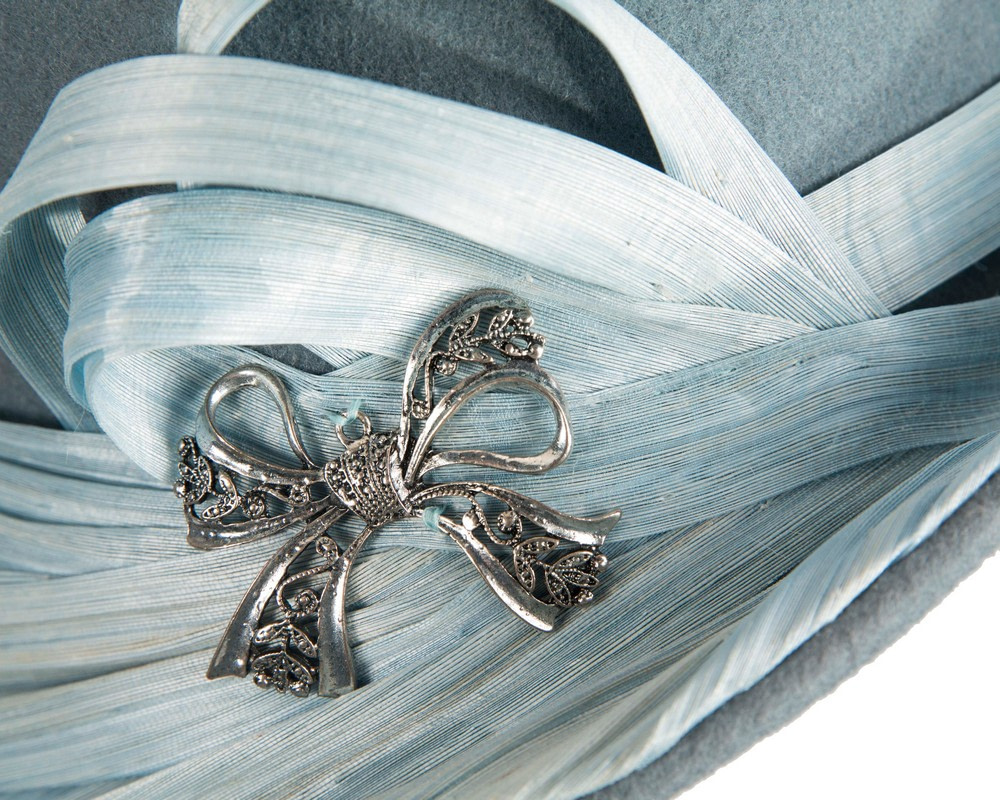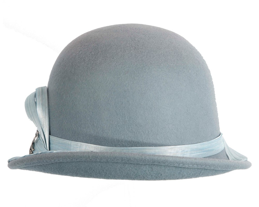 Petrol blue fashion winter felt hat by Cupids Millinery Melbourne. Classic cloche with upturned brim, draped in real silk abaca with addition of stylish bow buckle.