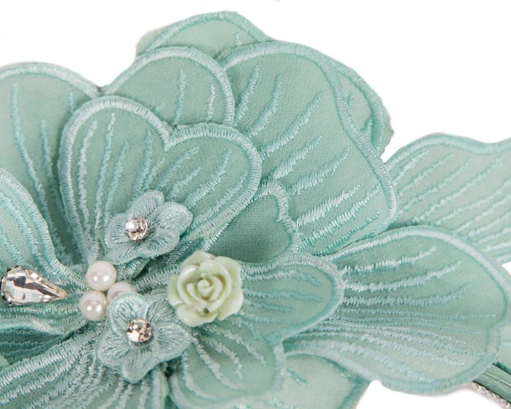 Created from luxurious lace, this mint green flower headband will be a perfect choice for your next racing outfit.