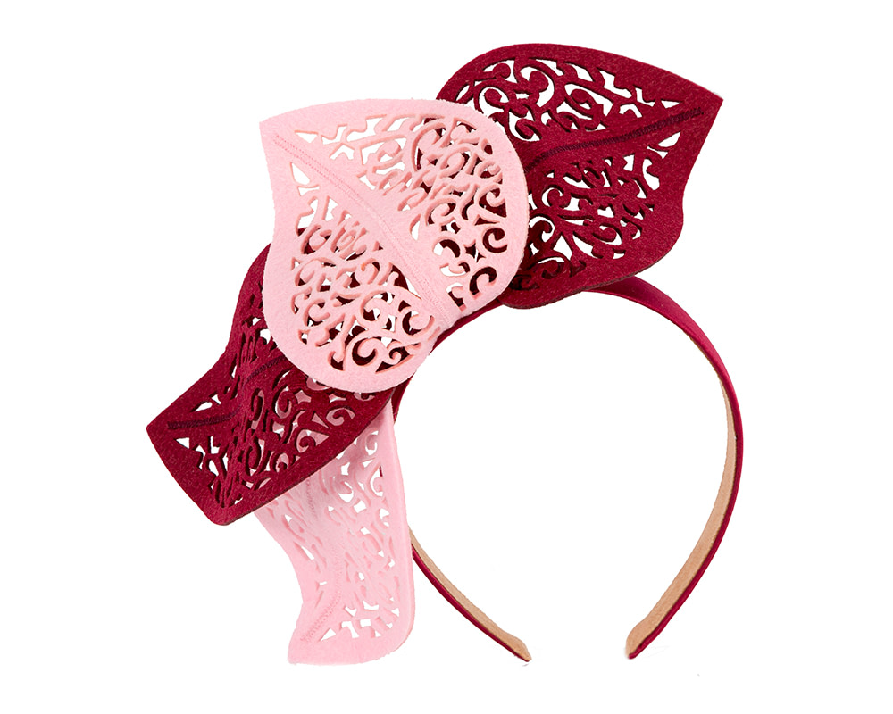 This modern, yet classic and elegant burgundy and pink fascinator from latest Max Alexander racing collection is hand made in Melbourne from precision burgundy wine and pink laser-cut leafs and is mounted on the headband for comfortable fit.