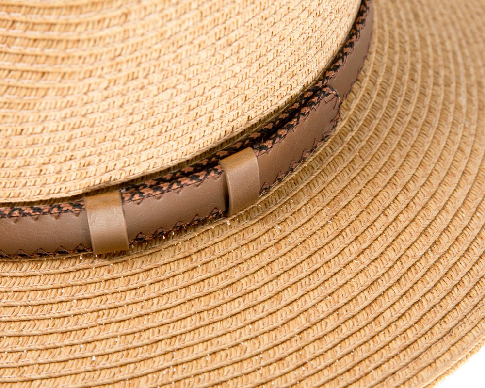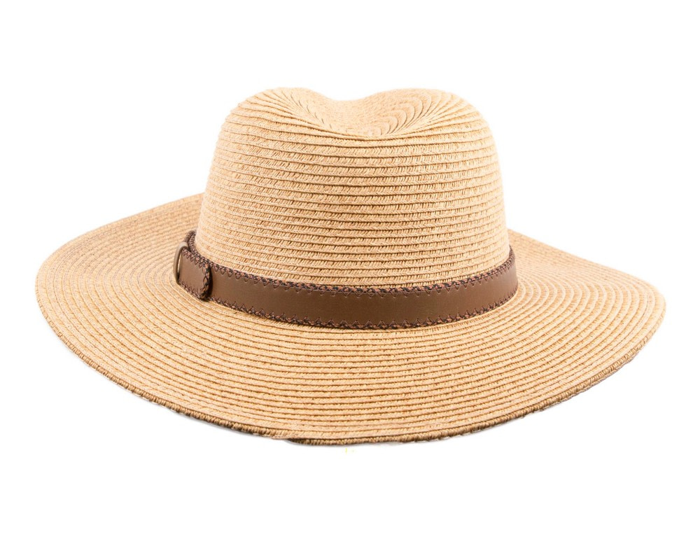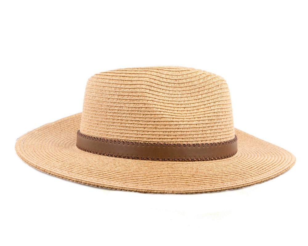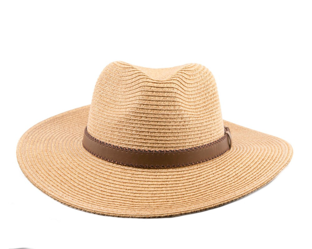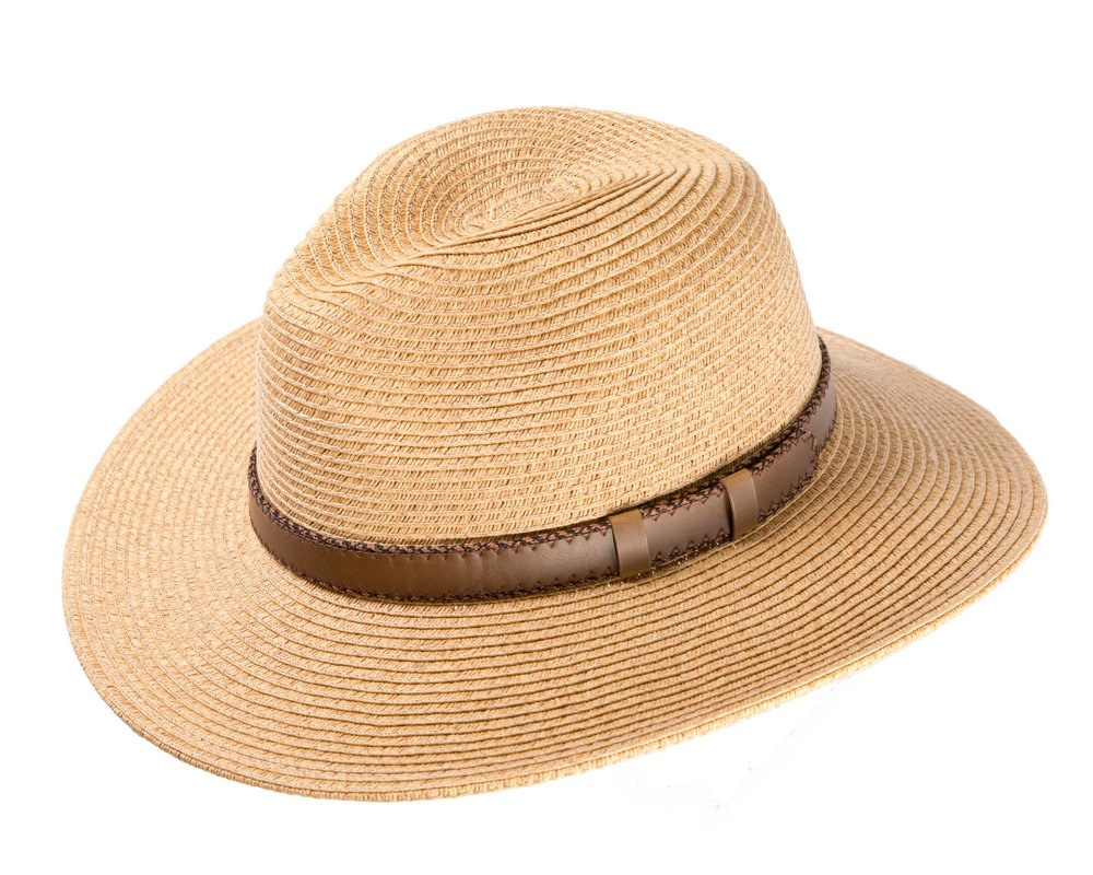 Natural braided safari fedora hat with leather-like hat band.