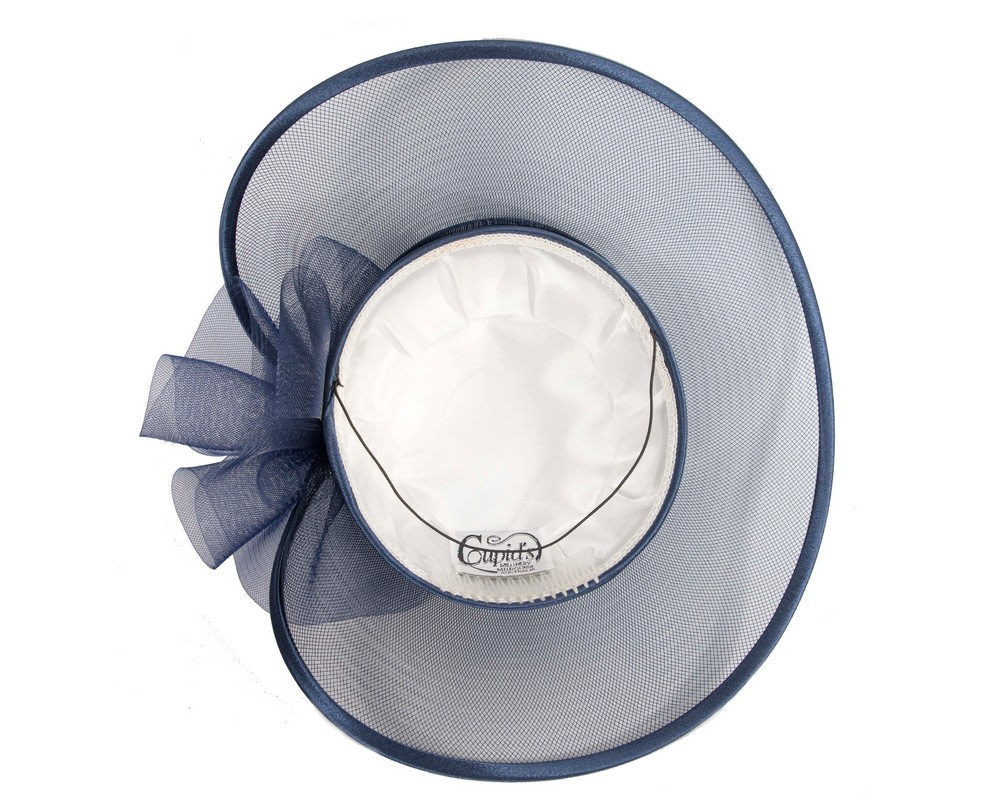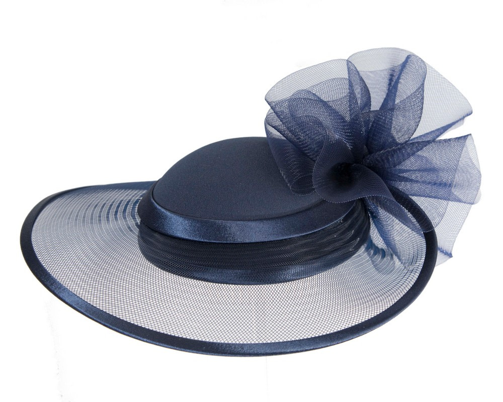This stunning navy hat from our beautiful range of “mother of the bride”, evening, church and special occasion hats is hand made from combination of dull and shiny sides of luxurious fabric with crinoline trim, fully lined and has comb for comfortable wearing.