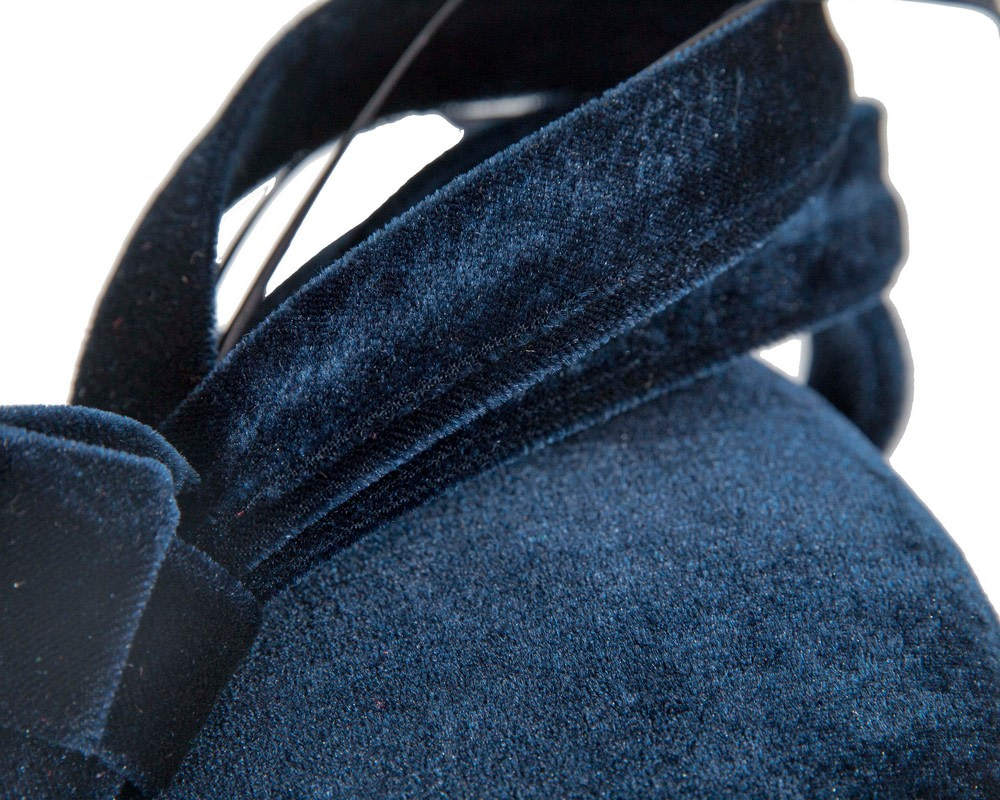 Beautiful navy velvet pillbox decorated with hand-made bow and soft feathers. Perfect choice for your next autumn or winter racing outfit.