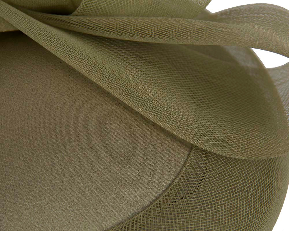 This fancy olive cocktail hat from our beautiful range of cocktail hats, headpieces and special occasion hats is custom made from luxurious fabric with synthetic horse hair (crinoline) and comb for comfortable wearing.
