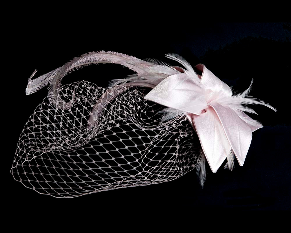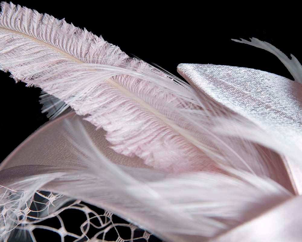 Stunning pink cocktail hat from our beautiful range of cocktail hats, headpieces and special occasion hats features flower made from luxurious fabric with two long feathers and facing veil. This cocktail hat is hand made to order in Melbourne, Australia and we can make it in many colours, making it perfect match for any outfit. From Melbourne Cup or Ascot to cocktail parties it will impress everyone!