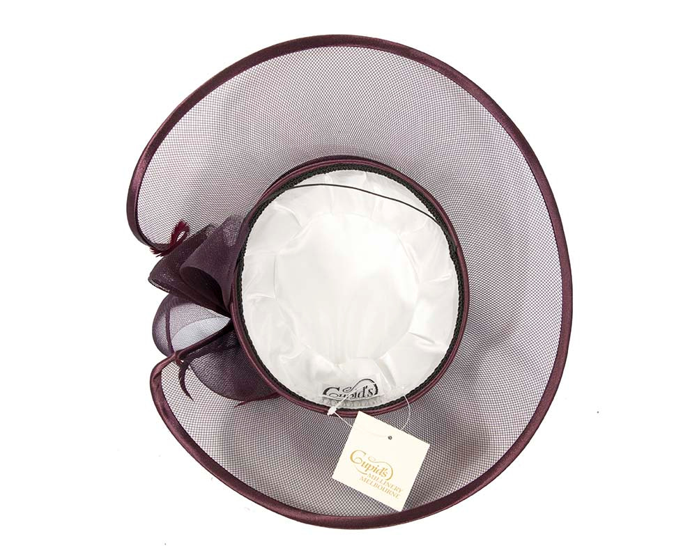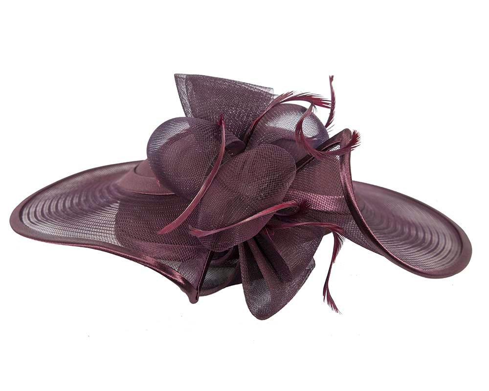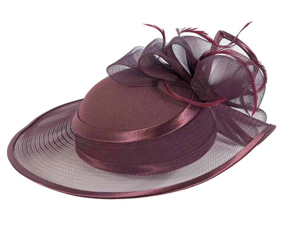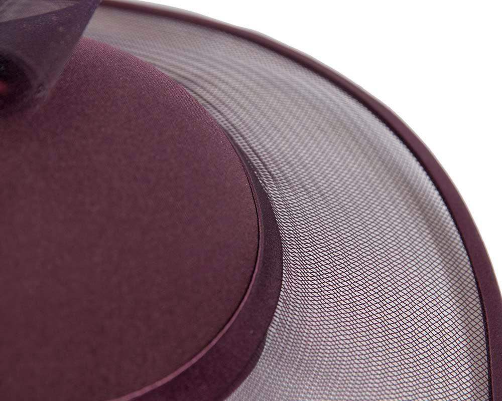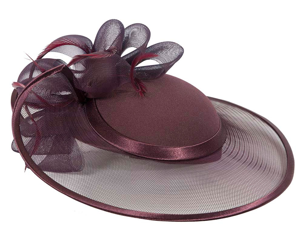 This stunning port wine hat from our beautiful range of mother of the bride, evening, church and special occasion hats is hand made from combination of dull and shiny sides of luxurious fabric with crinoline, fully lined and has comb for comfortable wearing. This designer fashion hat is made to order and we can make it in many colours.