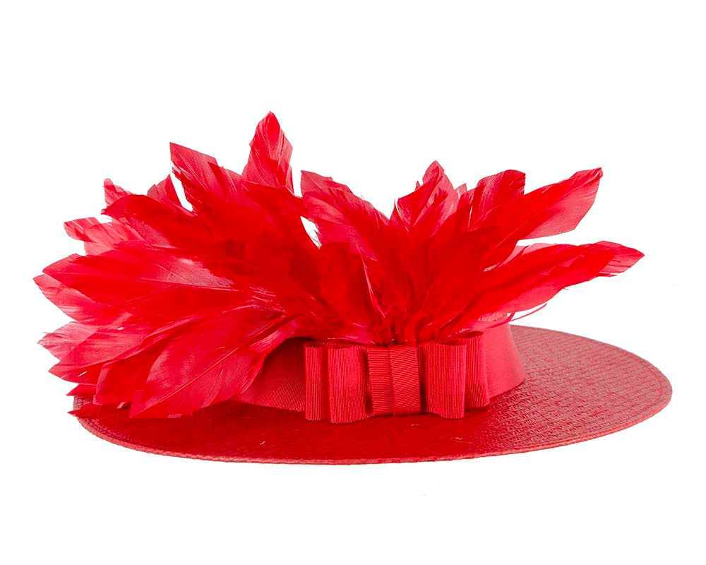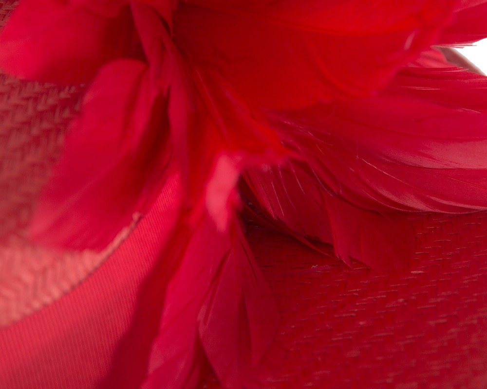 Latest in fashion — red boater hat from latest Max Alexander collection. Trimmed with feather cocktail, this light and elegant boater hat will be a perfect accessory to wear at race day.