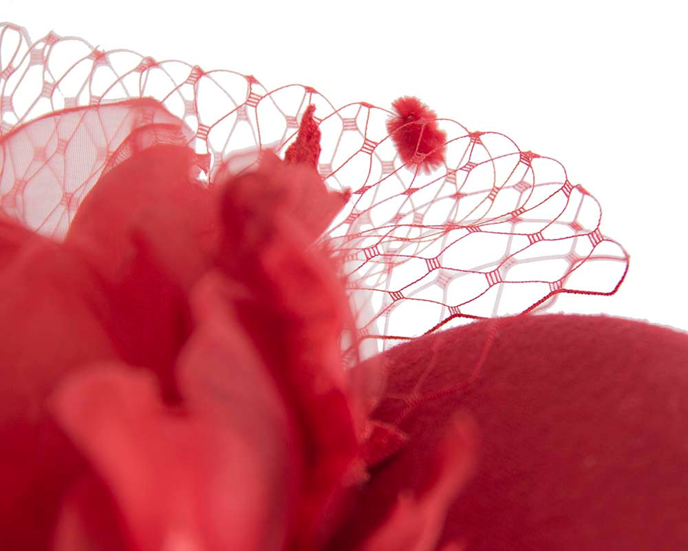 Red woolen pillbox topped with large silk flower. Made in Melbourne, this racing fascinator sports exceptional quality and style.