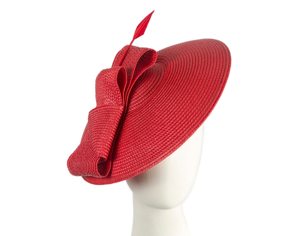Elegant wide brim red ladies fascinator hat with addition of a matching bow and long feather. Great choice for your next spring racing outfit.