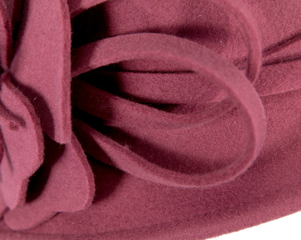 Rose pink felt cloche hat with short brim and hand-made felt flower.