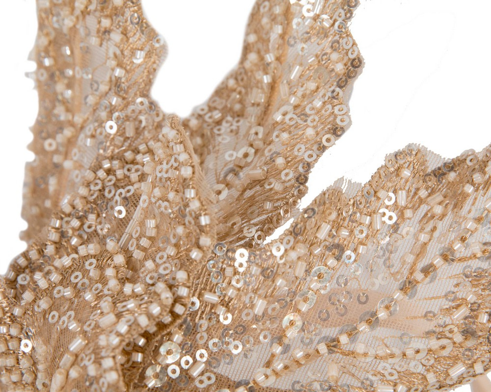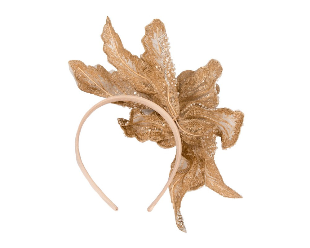 This stunning champagne Australian Made fascinator is the perfect accessory for a racing day outfit. Featuring a beautifully hand-crafted lace design covered in delicate sequins, this fascinator will add finishing touches to any outfit.