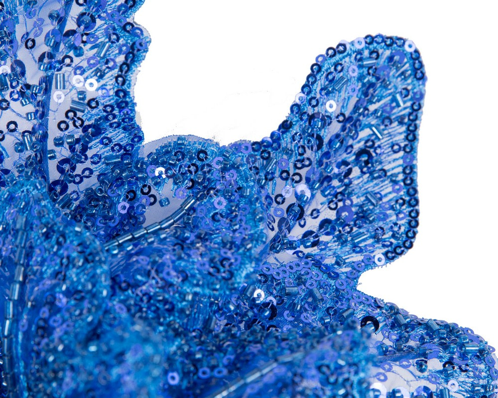 This stunning royal blue Australian Made fascinator is the perfect accessory for a racing day outfit. Featuring a beautifully hand-crafted lace design covered in delicate sequins, this fascinator will add finishing touches to any outfit.