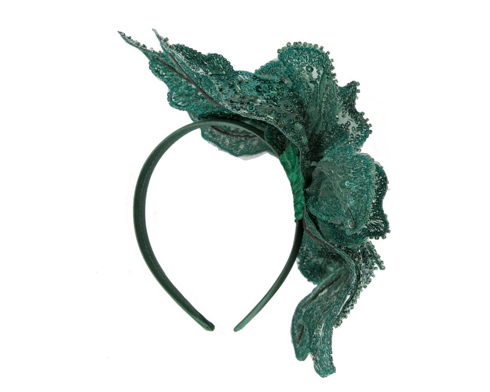 Shiny dark green lace fascinator by Fillies Collection