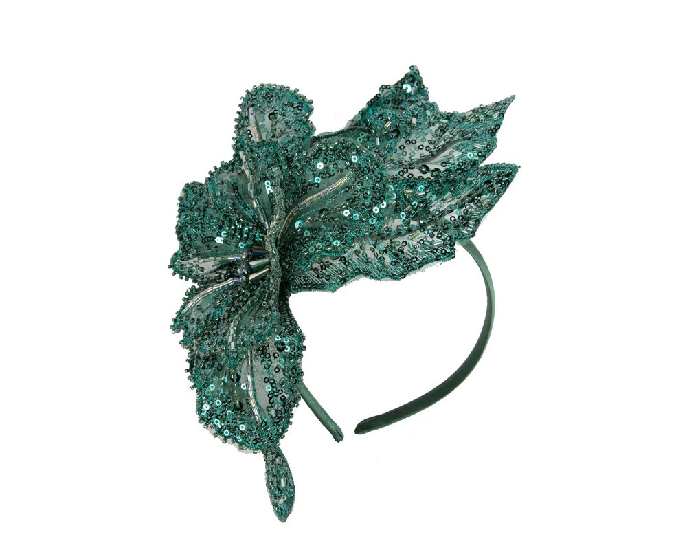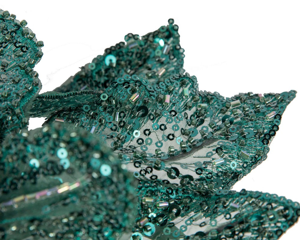 This stunning dark green Australian Made fascinator is the perfect accessory for a racing day outfit. Featuring a beautifully hand-crafted lace design covered in delicate sequins, this fascinator will add finishing touches to any outfit.