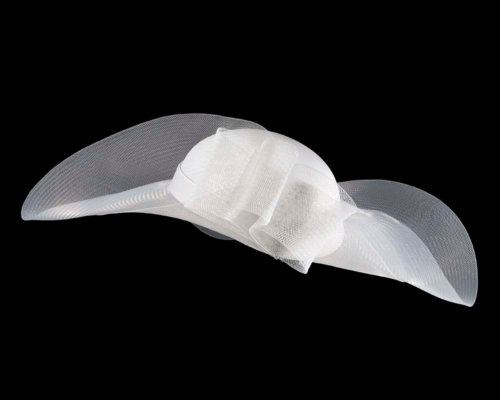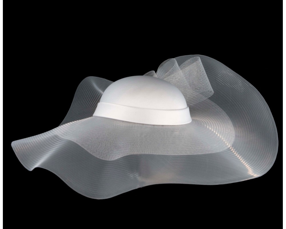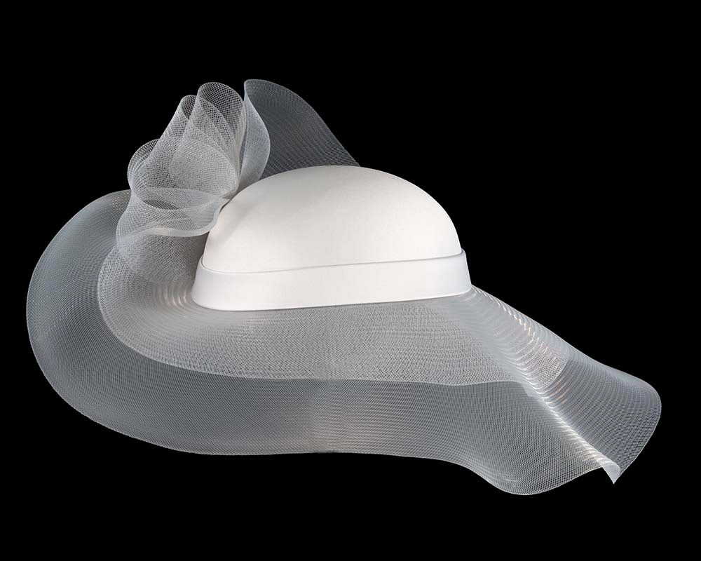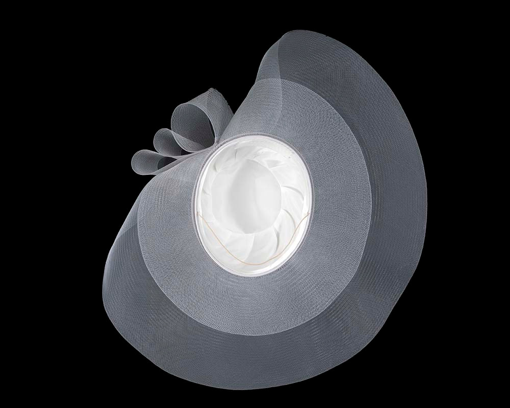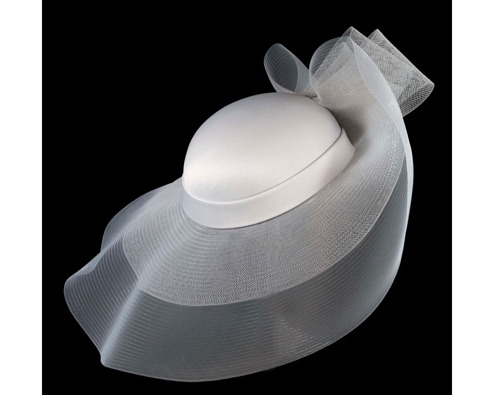 This silver ladies fashion hat is made from finest materials and features soft wide brim. Part of latest spring/summer racing collection, this hat is hand made by us in Melbourne and we can make it in any color to match your outfit.
