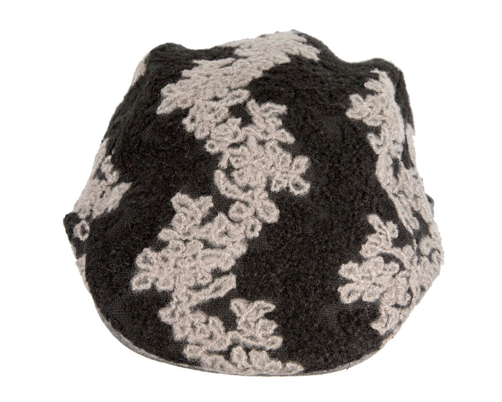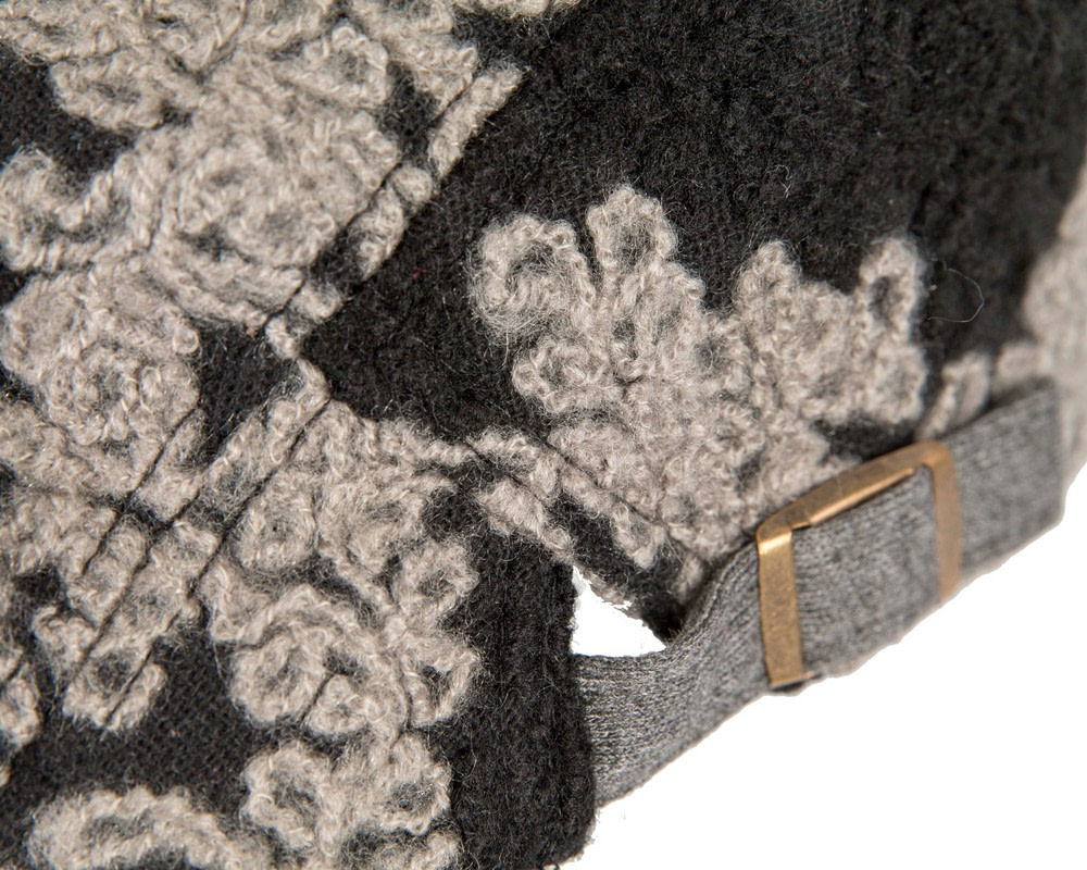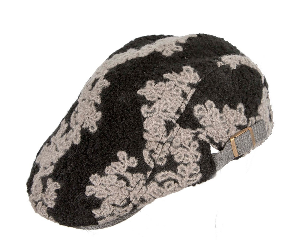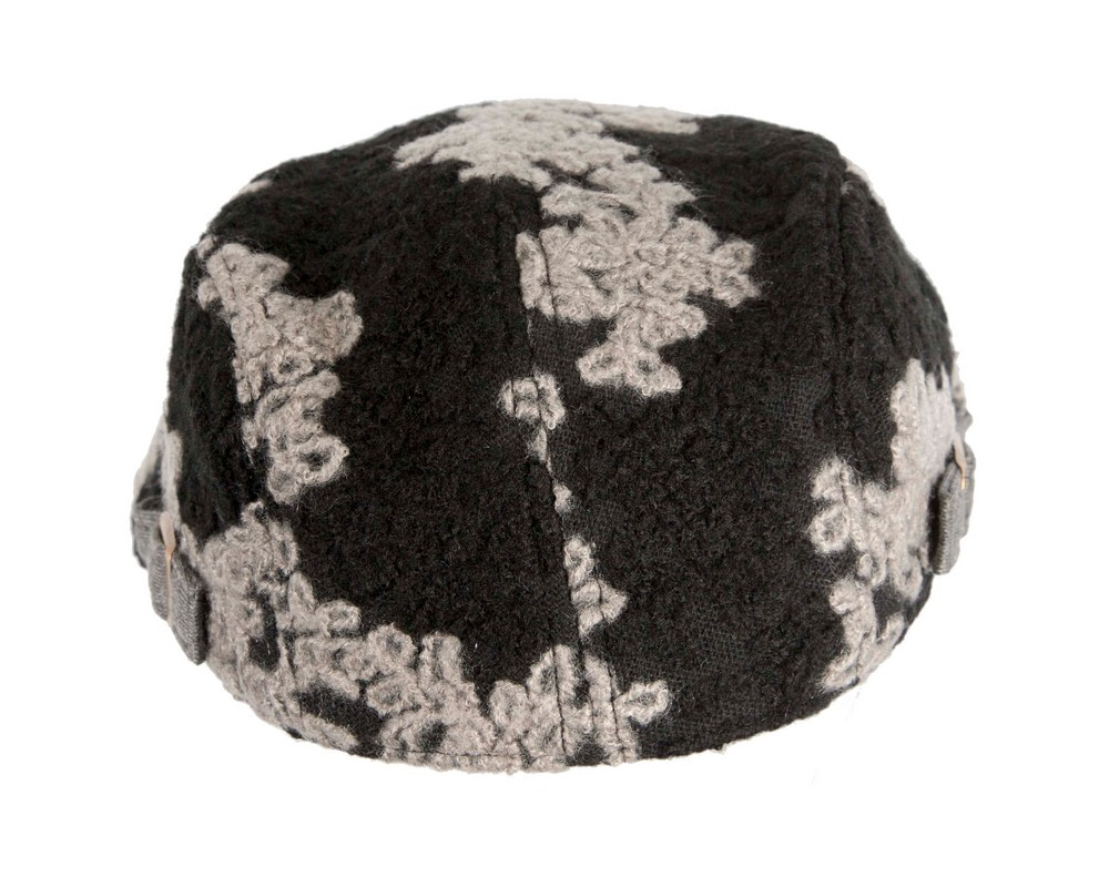Classic shape flat cap with beak by Max Alexander. This flat cap can be adjusted to fit any size up to 60cm. Made from soft black woolen fabric with grey embroidery.