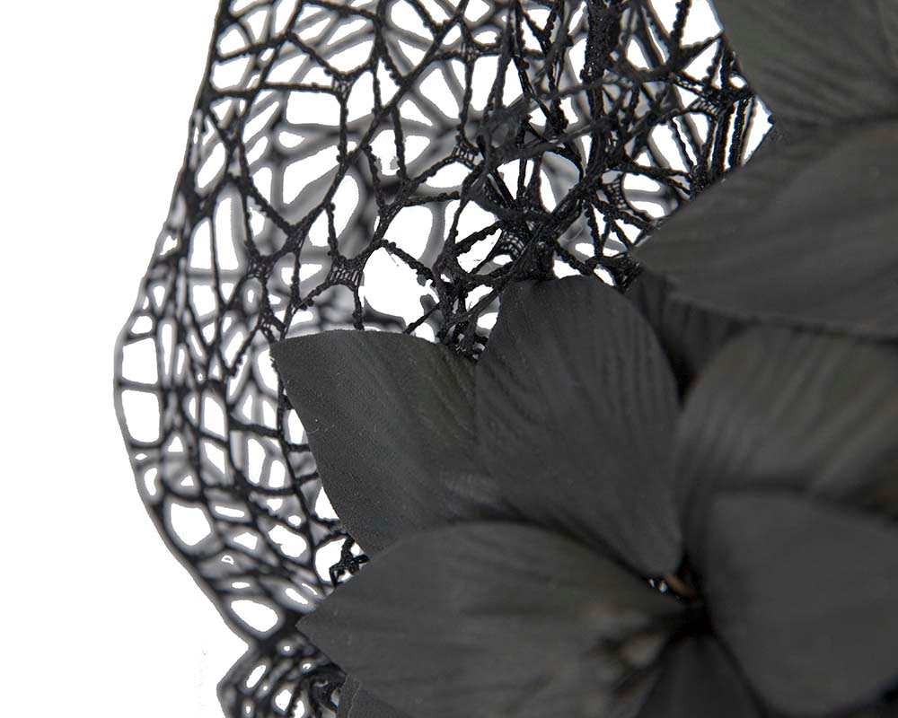 Staggering black fascinator. hand made in Melbourne. Black sculptured mesh embellished with black flowers and placed on the headband. A perfect choice for Melbourne Cup and spring racing carnivals.
