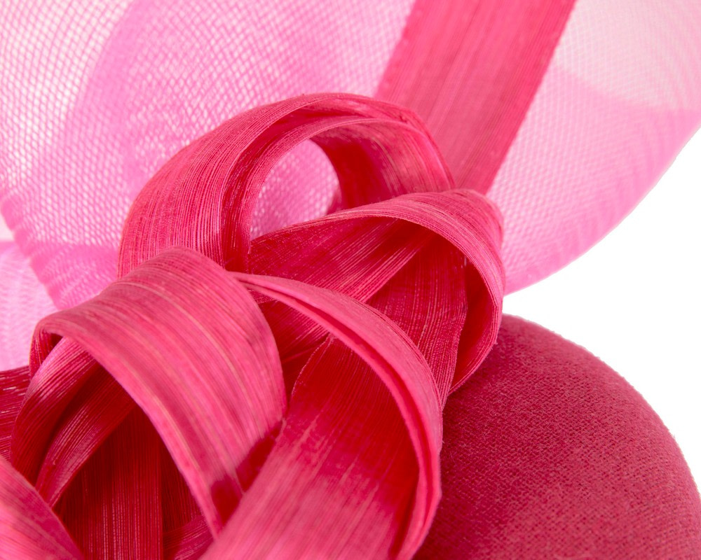 This elegant creation by Fillies Collection is expertly crafted by our milliners in Melbourne. Fuchsia woolen pillbox base embellished with tall crinoline and silk abaca loops and sails.