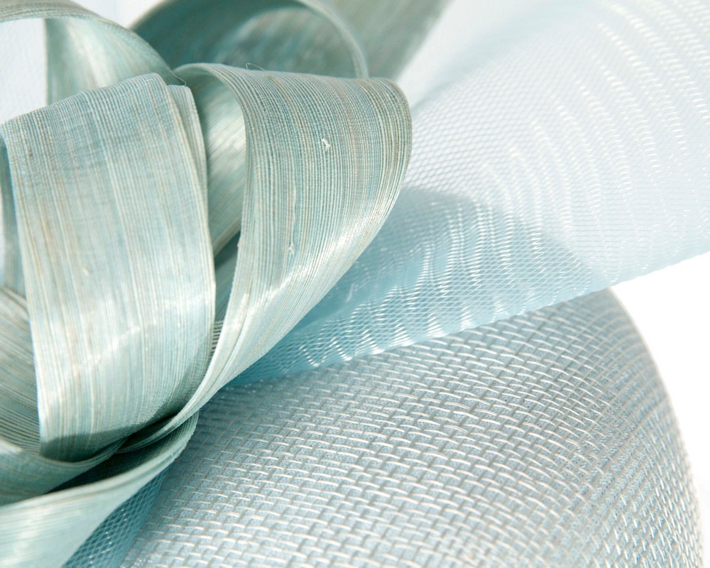 This elegant creation by Fillies Collection is expertly crafted by our milliners in Melbourne. Light Blue sinamay pillbox base embellished with tall crinoline and silk abaca loops and sails.