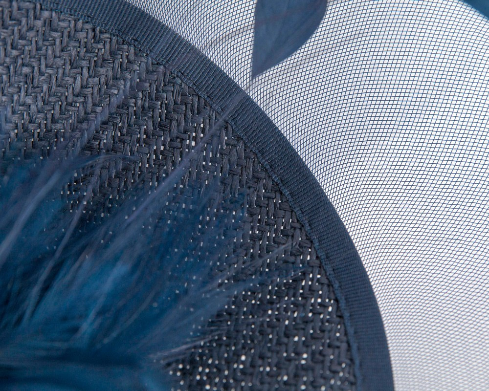 Exclusive navy fascinator with crinoline brim and feather center. Perfect choice for any spring racing outfit.