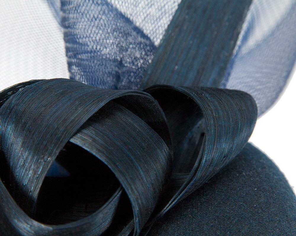 This elegant creation by Fillies Collection is expertly crafted by our milliners in Melbourne. Navy woolen pillbox base embellished with tall crinoline and silk abaca loops and sails.