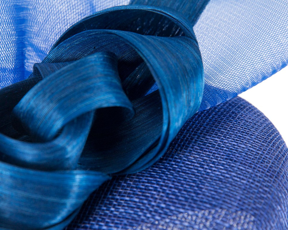 This elegant creation by Fillies Collection is expertly crafted by our milliners in Melbourne. Royal Blue sinamay pillbox base embellished with tall crinoline and silk abaca loops and sails.