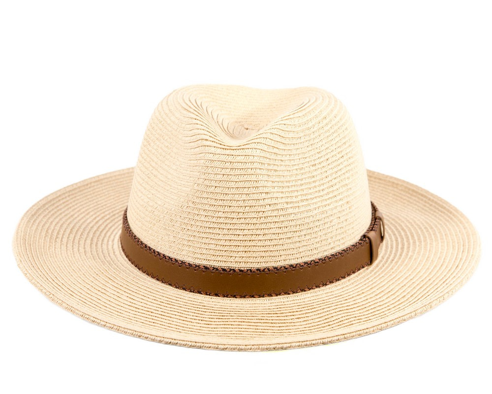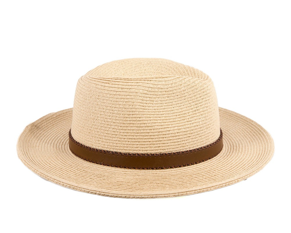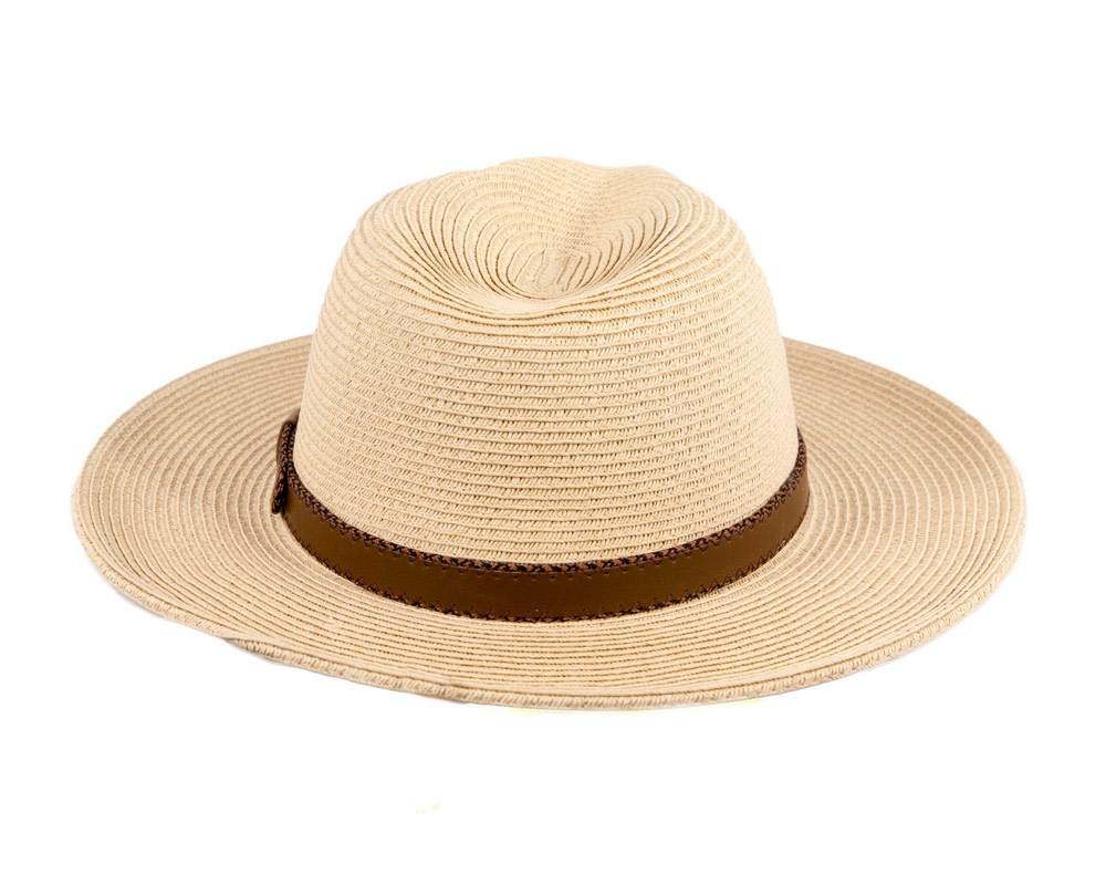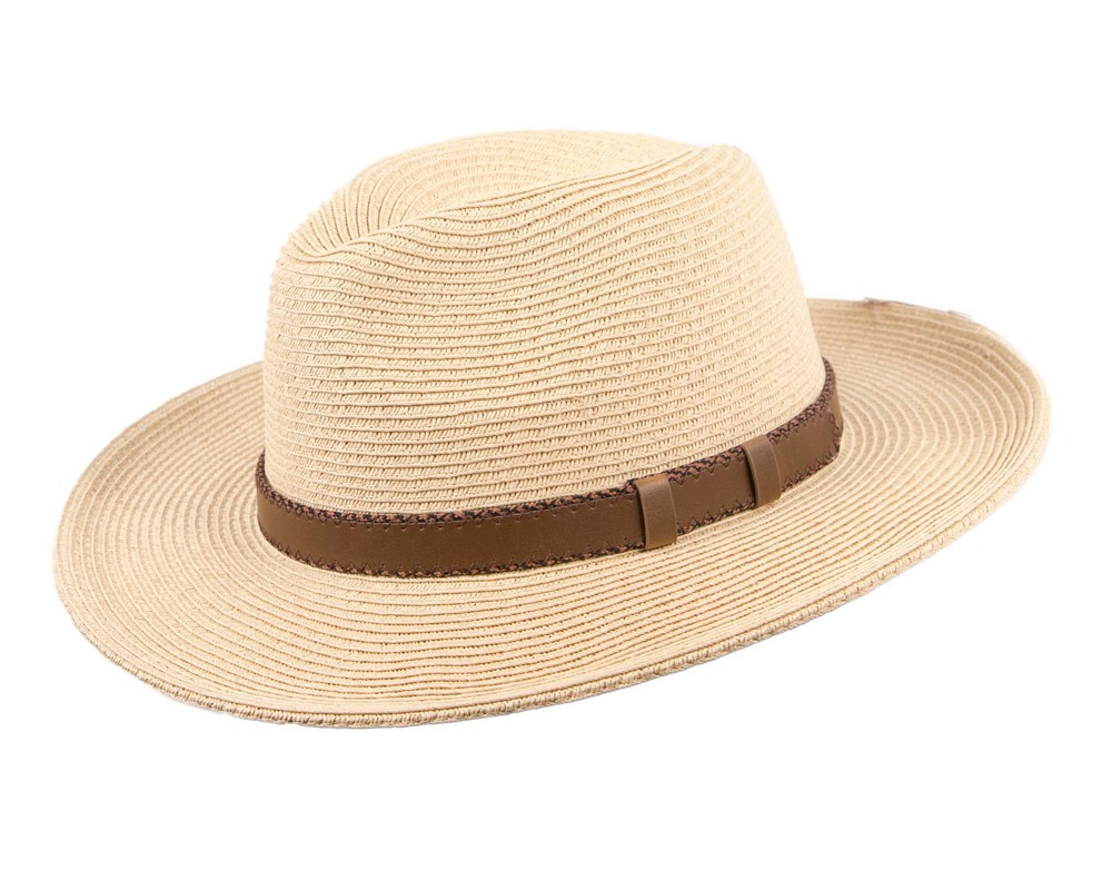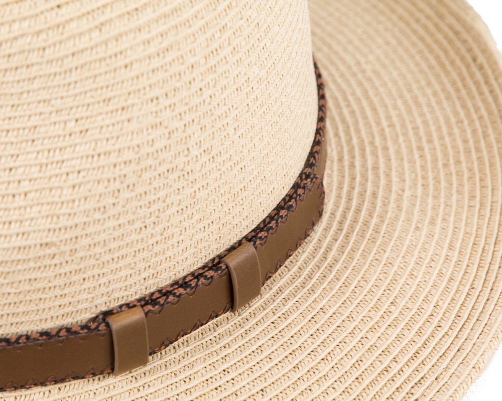Tan braided safari fedora hat with leather-like hat band.